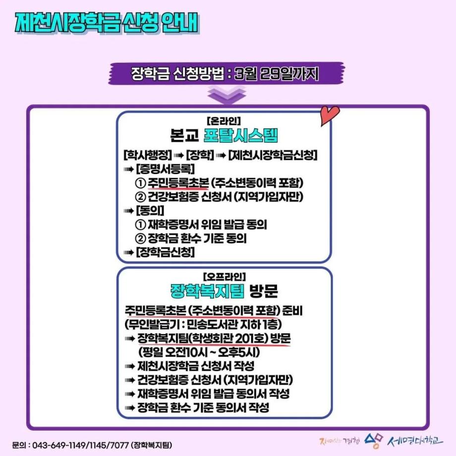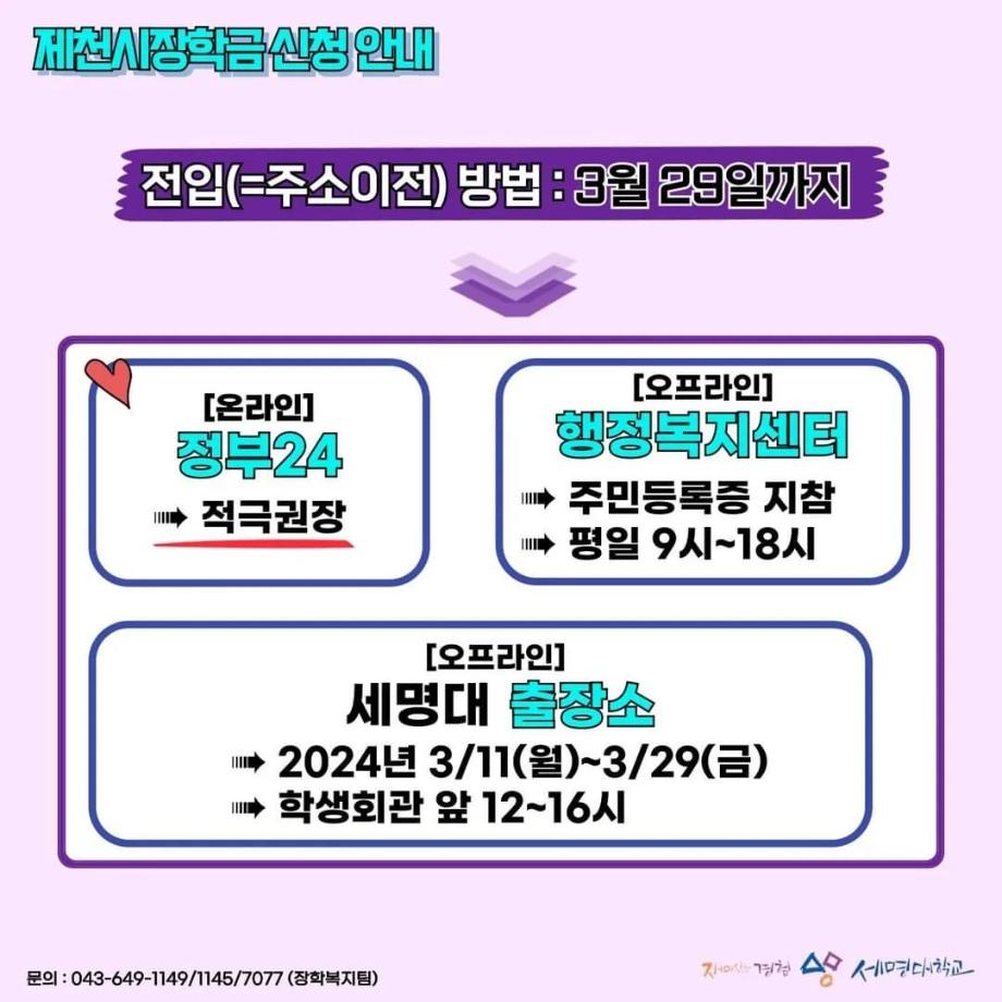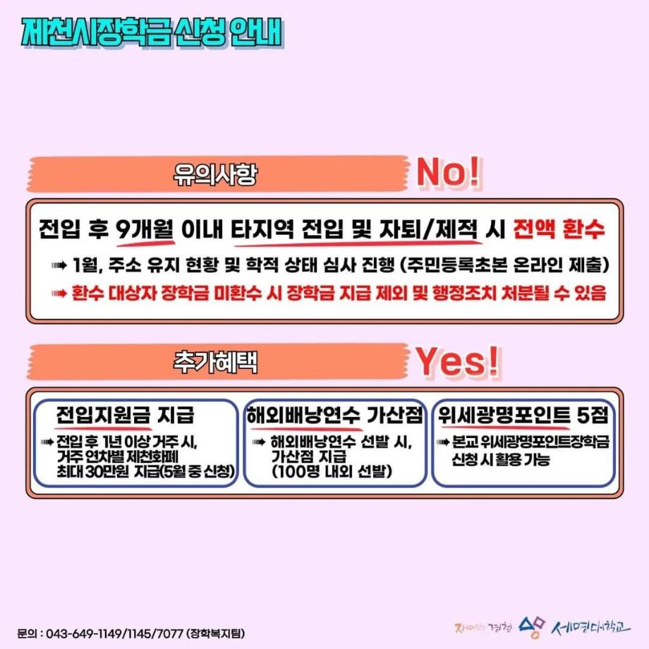 본문 시작 홈으로 SMIT 소식 SMIT 소개 SMIT 교육 SMIT 취업 SMIT 소식 SMIT 입학 홈페이지가이드 갤러리 공지사항 갤러리 경진대회 동아리 갤러리 페이스북 트위터 프린트 제천시 전입 장학금 안내 ! 스마트IT학부 2672 2024-03-29 ⏲ 신청기간 : 3월 29일(금) 까지 제천시로 전입하면 100만원을 드려요~ 목록 이전✨모듈형 교육과정✨ 안내 다음 엉뚱한 연구활동 프로그램 시행안내! 담당부서 : 스마트IT학부 담당자 : - 연락처 : 043-649-1275 최종수정일 : 2024-10-26 만족도조사 만족도 조사 이 페이지에서 제공하는 정보에 대하여 만족하시나요? 매우만족 만족 보통 불만족 매우불만족