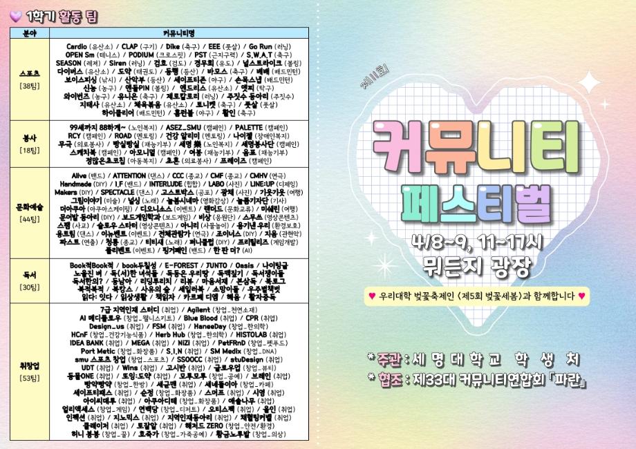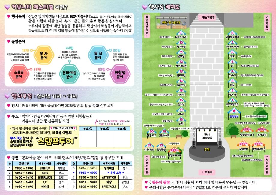 본문 시작 홈으로 SMIT 소식 SMIT 소개 SMIT 교육 SMIT 취업 SMIT 소식 SMIT 입학 홈페이지가이드 갤러리 공지사항 갤러리 경진대회 동아리 갤러리 페이스북 트위터 프린트 🎪 <제11회 커뮤니티 페스티벌> 시행 안내 🎪 스마트IT학부 40 2026-04-06 🎪 <제11회 커뮤니티 페스티벌> 시행 안내 🎪 목록 이전AI융합대학으로 명칭 변경! 다음 제 5회 세명대학교 벚꽃축제 '벚꽃세봄' 개최 안내 담당부서 : 스마트IT학부 담당자 : - 연락처 : 043-649-1275 최종수정일 : 2024-10-26 만족도조사 만족도 조사 이 페이지에서 제공하는 정보에 대하여 만족하시나요? 매우만족 만족 보통 불만족 매우불만족