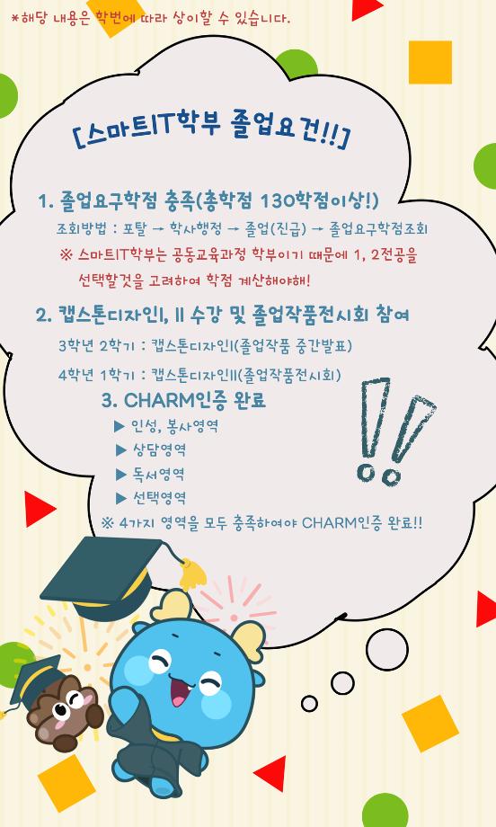 본문 시작 홈으로 SMIT 소식 SMIT 소개 SMIT 교육 SMIT 취업 SMIT 소식 SMIT 입학 홈페이지가이드 갤러리 공지사항 갤러리 경진대회 동아리 갤러리 페이스북 트위터 프린트 스마트IT알림_4월 : 스마트IT학부 졸업요건 스마트IT학부 55 2026-04-14 스마트IT알림_4월 : 스마트IT학부 졸업요건 목록 이전세명대알림_4월(2) : 세명대학교 벚꽃 담당부서 : 스마트IT학부 담당자 : - 연락처 : 043-649-1275 최종수정일 : 2024-10-26 만족도조사 만족도 조사 이 페이지에서 제공하는 정보에 대하여 만족하시나요? 매우만족 만족 보통 불만족 매우불만족