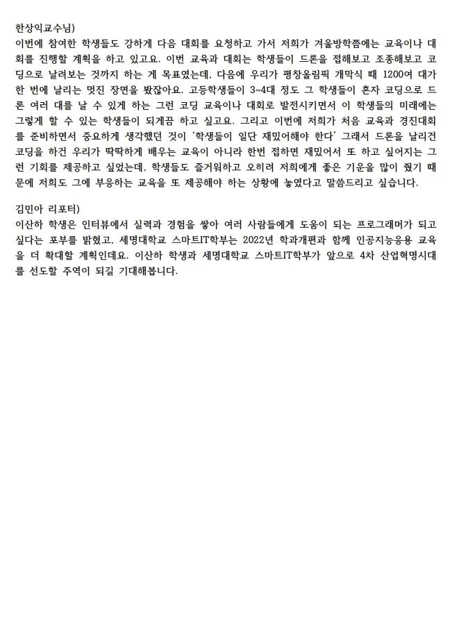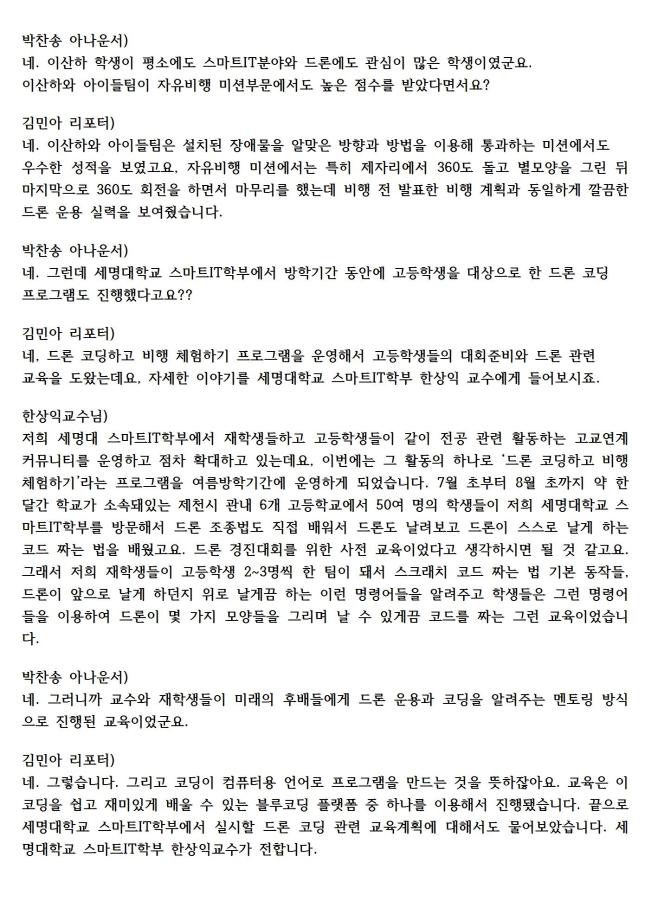 본문 시작 홈으로 SMIT 소식 SMIT 소개 SMIT 교육 SMIT 취업 SMIT 소식 SMIT 입학 홈페이지가이드 갤러리 공지사항 갤러리 경진대회 동아리 갤러리 페이스북 트위터 프린트 21.08.30(월) SM 스마트 드론 레이싱 경진대회 관련 라디오 출연 스마트IT학부 3811 2021-09-23 지난 8월19일(목)에 진행한 "SM 스마트 드론 레이싱 경진대회"와 관련하여 최우수상을 수상한 충주상업고 학생과 스마트IT학부 한상익교수님이 출연하여 수상소감대회 및 준비과정과 진행 방식등을 설명하였다. 목록 이전2021. SM 스마트 드론 레이싱 경진대회 기사 다음 2021.09.03(금) 스마트IT학부 한상익교수님 라디오 출연 담당부서 : 스마트IT학부 담당자 : - 연락처 : 043-649-1275 최종수정일 : 2024-10-26 만족도조사 만족도 조사 이 페이지에서 제공하는 정보에 대하여 만족하시나요? 매우만족 만족 보통 불만족 매우불만족