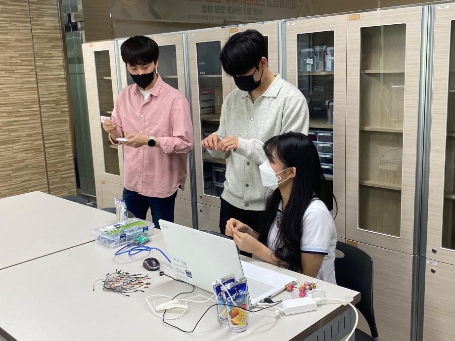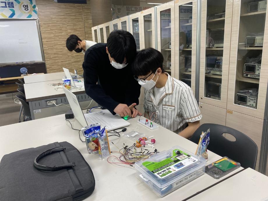 또한 스마트IT학부 전공기초 실습인 아두이노를 이용한 LED 및 음성제어 관련 코딩을 체험하는 실습 체험과 질의응답 시간과 학부 기념품 증정 및 단체 사진 촬영을 진행하였다.