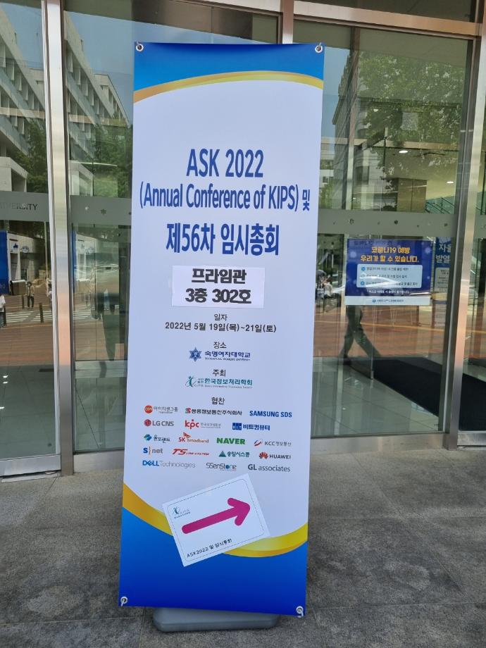 5월20일(금)에는 숙명여자대학교 프라임관에서 2022 춘계학술 발표대회 개회식이 이루어졌는데, 스마트IT학부 이종환 학생 외 3명이 학부생 논문경진대회에서 장려상을 수상했다. 학부생으로서 권위있는 학술대회에서 눈물을 발표하고 학술교류에 참가함으로써 인공지능 및 SW분야 최신 동향을 파악하고 학술발표를 통해 자신감을 고취할 수 있는 의미있는 행사였다.