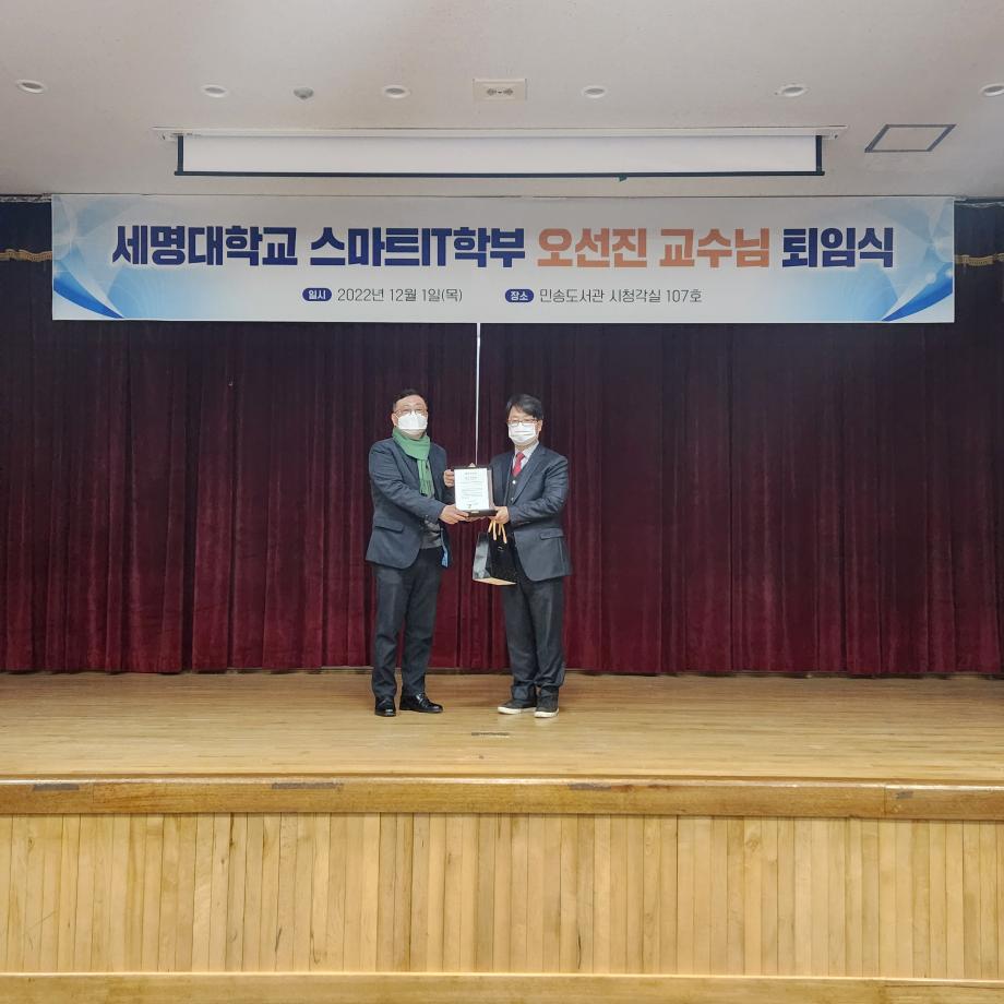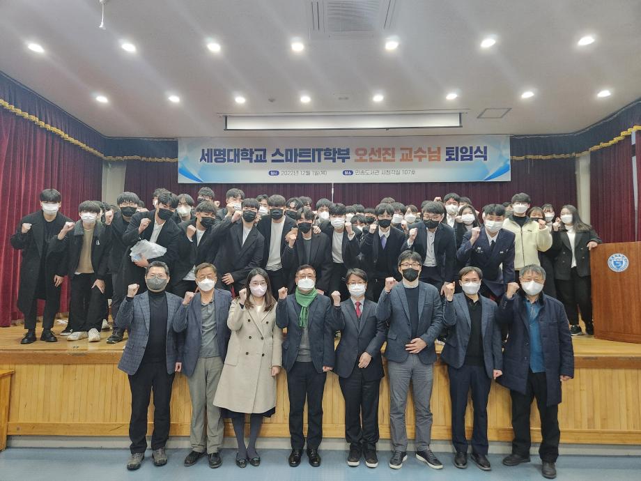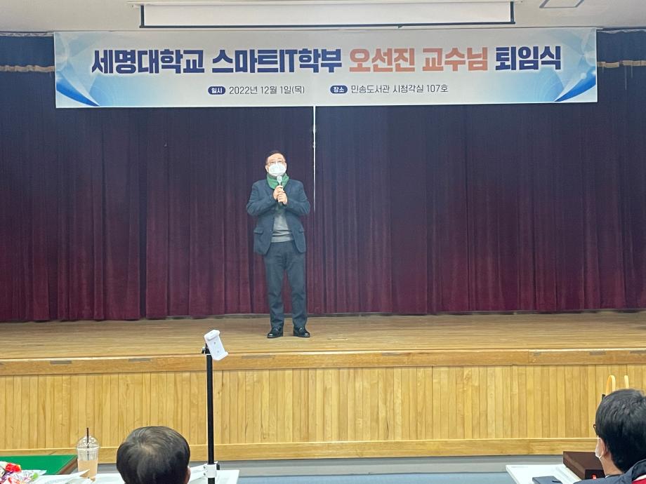 본문 시작 홈으로 SMIT 소식 SMIT 소개 SMIT 교육 SMIT 취업 SMIT 소식 SMIT 입학 홈페이지가이드 갤러리 공지사항 갤러리 경진대회 동아리 갤러리 페이스북 트위터 프린트 오선진 교수님 퇴임식 스마트IT학부 5940 2022-12-06 2022.12.01(목)에 스마트IT학부 오선진 교수님의 명예로운 퇴임식이 시행 되었다. 본 행사는 <캡스톤 디자인 중간 발표회> 행사가 끝난 후 진행 되었다. 학생들의 영상편지와 재직 기념패 증정 및 꽃다발 증정으로 이루어졌다. 오선진 교수님의 퇴임사와 김지홍 교수님의 축하 인사말이 있었다. 스마트IT학부 재학생들과 교수님들은 진심으로 오선진 교수님의 명예로운 퇴임을 축하 하였다. 목록 이전스마트IT학부 2022학년도 캡스톤중간발표회 시행 다음 스마트IT학부 원주 대성고등학교 특강시행 담당부서 : 스마트IT학부 담당자 : - 연락처 : 043-649-1275 최종수정일 : 2024-10-26 만족도조사 만족도 조사 이 페이지에서 제공하는 정보에 대하여 만족하시나요? 매우만족 만족 보통 불만족 매우불만족