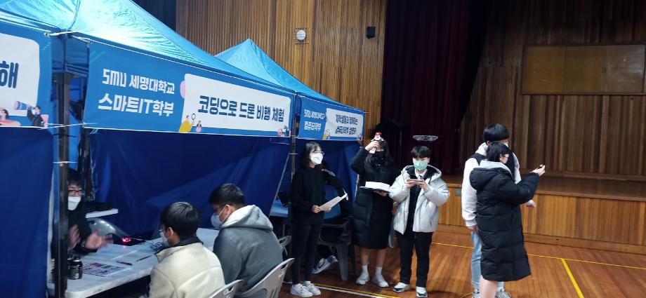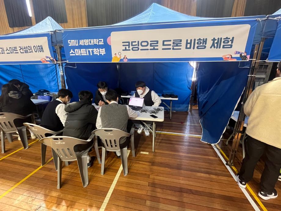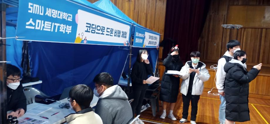 본문 시작 홈으로 SMIT 소식 SMIT 소개 SMIT 교육 SMIT 취업 SMIT 소식 SMIT 입학 홈페이지가이드 갤러리 공지사항 갤러리 경진대회 동아리 갤러리 페이스북 트위터 프린트 스마트IT학부 단양고 중등교육 연계프로그램 시행 스마트IT학부 5100 2022-12-22 스마트IT학부는 2022.12.22(목)에 단양고등학교 전공체험에 참가하였다. 한상익 교수님 주관으로 진행 되었으며, 스마트IT학부 재학생들이 보조 학생으로 참가하였다. 전공체험은 '코딩으로 드론 비행 체험'이라는 주제로 진행되었다. 단양고등학교 학생들에게 드론 조종법을 교육하고, 드론 비행 체험을 진행하게 하였다. 또한 스마트IT학부의 드론,자율주행차와 인공지능응용 전공에 대하여 소개하였다. 목록 이전스마트IT학부 2022학년도 2학기 전공학습동아리 수료 다음 스마트IT학부 정보처리기사 자격증 특강 시행 담당부서 : 스마트IT학부 담당자 : - 연락처 : 043-649-1275 최종수정일 : 2024-10-26 만족도조사 만족도 조사 이 페이지에서 제공하는 정보에 대하여 만족하시나요? 매우만족 만족 보통 불만족 매우불만족