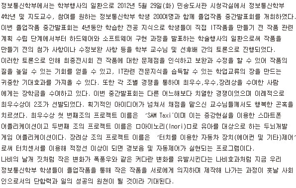 본문 시작 홈으로 SMIT 소식 SMIT 소개 SMIT 교육 SMIT 취업 SMIT 소식 SMIT 입학 홈페이지가이드 갤러리 공지사항 갤러리 경진대회 동아리 갤러리 페이스북 트위터 프린트 정보통신학부 졸업작품전 개최 오선진 7023 2012-10-04 일시 : 2012년 9월 18일 장소 : 제천 시민회관 2층 전시실 목록 이전2012학년도 졸업작품 중간발표회 개최 다음 2012년도 정보통신학부 연합 MT 담당부서 : 스마트IT학부 담당자 : - 연락처 : 043-649-1275 최종수정일 : 2024-10-26 만족도조사 만족도 조사 이 페이지에서 제공하는 정보에 대하여 만족하시나요? 매우만족 만족 보통 불만족 매우불만족