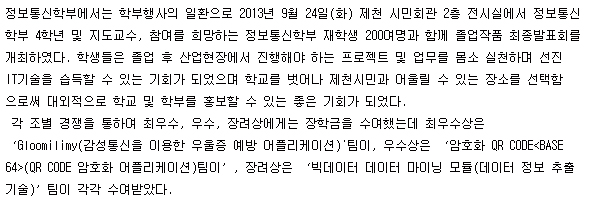 본문 시작 홈으로 SMIT 소식 SMIT 소개 SMIT 교육 SMIT 취업 SMIT 소식 SMIT 입학 홈페이지가이드 갤러리 공지사항 갤러리 경진대회 동아리 갤러리 페이스북 트위터 프린트 정보통신학부 연합 MT 개최 오선진 7789 2013-10-11 단양 대명 리조트 목록 이전2013학년도 졸업작품전 개최 다음 2013-2학기 졸업생 초청 학술특강 개최 담당부서 : 스마트IT학부 담당자 : - 연락처 : 043-649-1275 최종수정일 : 2024-10-26 만족도조사 만족도 조사 이 페이지에서 제공하는 정보에 대하여 만족하시나요? 매우만족 만족 보통 불만족 매우불만족