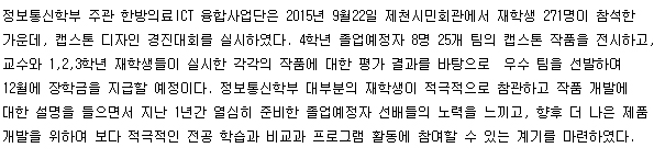 본문 시작 홈으로 SMIT 소식 SMIT 소개 SMIT 교육 SMIT 취업 SMIT 소식 SMIT 입학 홈페이지가이드 갤러리 공지사항 갤러리 경진대회 동아리 갤러리 페이스북 트위터 프린트 한방-의료ICT 융합사업단, 융합전공 동아리 오리엔테이션 진행 관리자 6236 2015-09-30 한방-의료ICT 융합사업단, 융합전공 동아리 오리엔테이션 진행 목록 이전한방-의료ICT 융합사업단, 캡스톤 디자인 경진대회 실시 다음 사물 인터넷 국제 전시회 담당부서 : 스마트IT학부 담당자 : - 연락처 : 043-649-1275 최종수정일 : 2024-10-26 만족도조사 만족도 조사 이 페이지에서 제공하는 정보에 대하여 만족하시나요? 매우만족 만족 보통 불만족 매우불만족