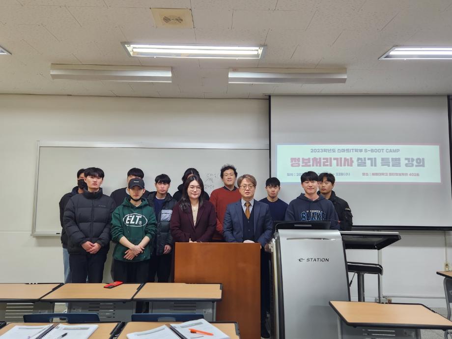 본문 시작 홈으로 SMIT 소식 SMIT 소개 SMIT 교육 SMIT 취업 SMIT 소식 SMIT 입학 홈페이지가이드 갤러리 공지사항 갤러리 경진대회 동아리 갤러리 페이스북 트위터 프린트 S-Boot Camp 정보처리기사 실기 특강 스마트IT학부 3872 2023-11-29 스마트IT학부는 4학년 재학생들을 대상으로 첨단정보학관 402호에서 2023.11.01(수), 08(수), 15(수), 22(수) 총 4주 동안 S-Boot Camp 정보처리기사 실기 특강을 시행했습니다. S-Boot Camp 정보처리기 실기 특강으로 학생들의 직무 역량을 강화할 수 있는 유익한 시간이었습니다. 목록 이전📌 잊지 말고! 수시 최초합격자 등록하자!! 다음 📌 2024학년도 세명대 정시 모집요강 안내 📌 담당부서 : 스마트IT학부 담당자 : - 연락처 : 043-649-1275 최종수정일 : 2024-10-26 만족도조사 만족도 조사 이 페이지에서 제공하는 정보에 대하여 만족하시나요? 매우만족 만족 보통 불만족 매우불만족