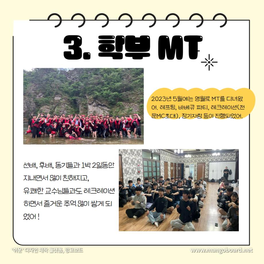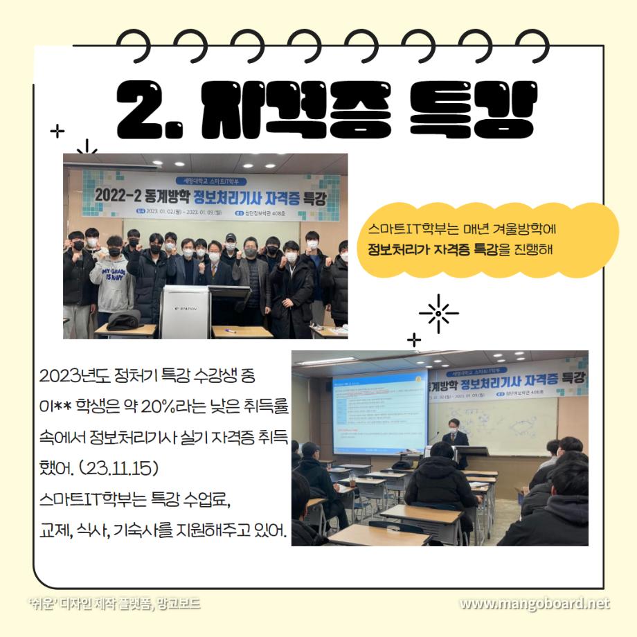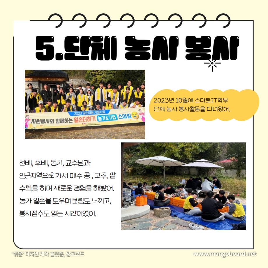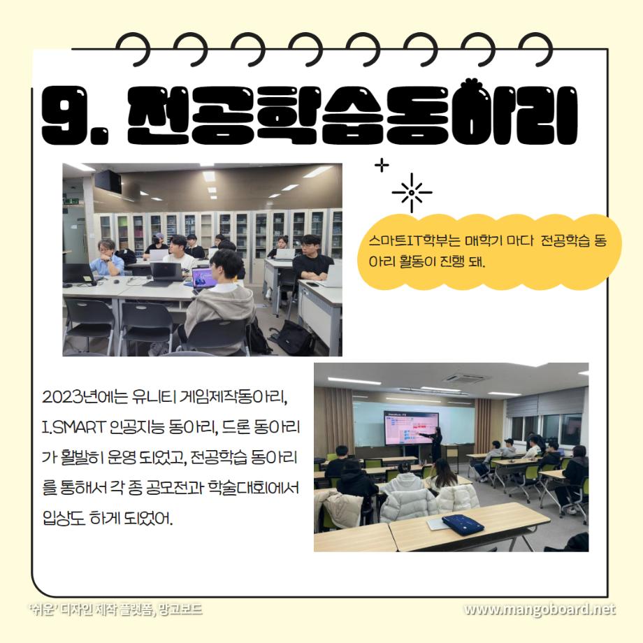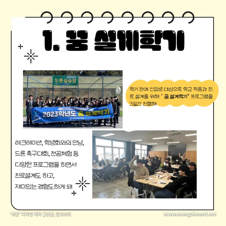 본문 시작 홈으로 SMIT 소식 SMIT 소개 SMIT 교육 SMIT 취업 SMIT 소식 SMIT 입학 홈페이지가이드 갤러리 공지사항 갤러리 경진대회 동아리 갤러리 페이스북 트위터 프린트 세명대학교 스마트IT학부는 이런 활동을 한다 ❗ 스마트IT학부 2720 2024-01-04 세명대학교 스마트IT학부는 이런 활동을 한다 ❗ 안녕하세요. 세명대학교 스마트IT학부입니다. 😍 2023년도에 진행한 스마트IT학부의 유익하고 즐거웠던 프로그램들 함께 보실까요 ?!😊 세명대 스마트IT학부는 재학생들을 위한 다양하고 재미있는 프로그램들이 활발히 운영하고 있습니다. ❤️ 목록 이전2023-2학기 드론 동아리 시행🎈 다음 실무경험 ? 자격증? 취업 All in 세명대학교 스마트IT학부 담당부서 : 스마트IT학부 담당자 : - 연락처 : 043-649-1275 최종수정일 : 2024-10-26 만족도조사 만족도 조사 이 페이지에서 제공하는 정보에 대하여 만족하시나요? 매우만족 만족 보통 불만족 매우불만족