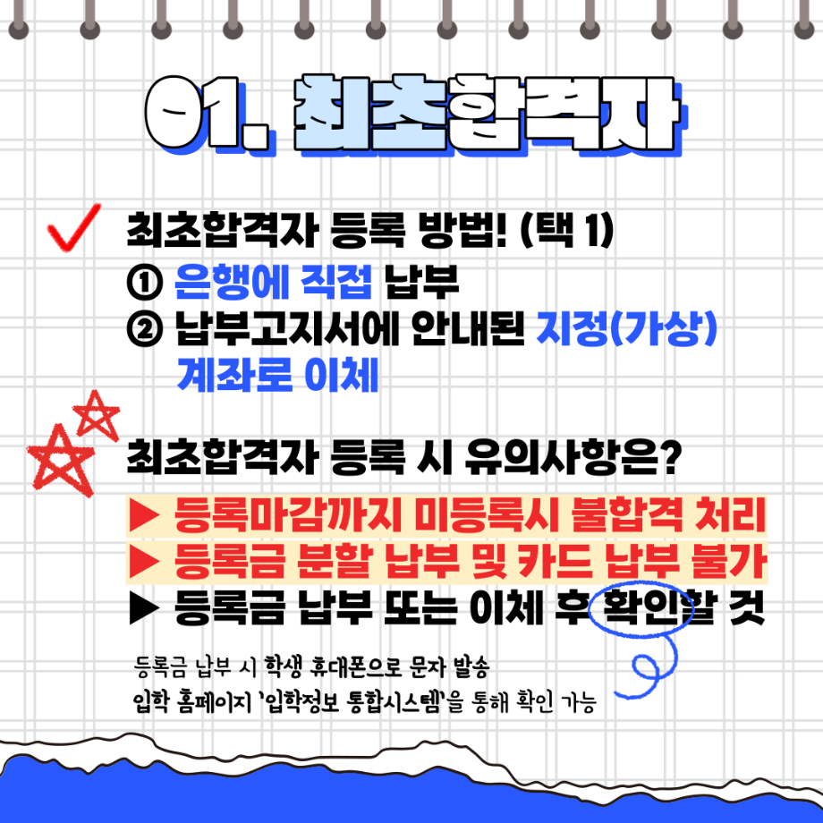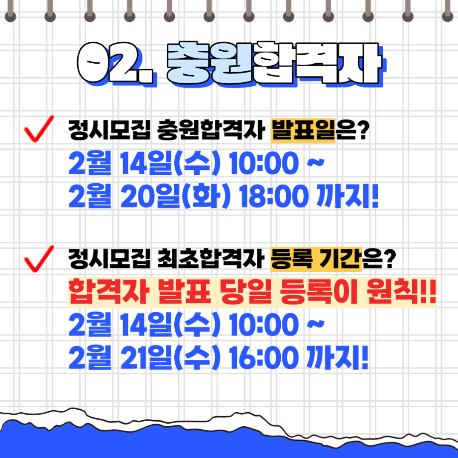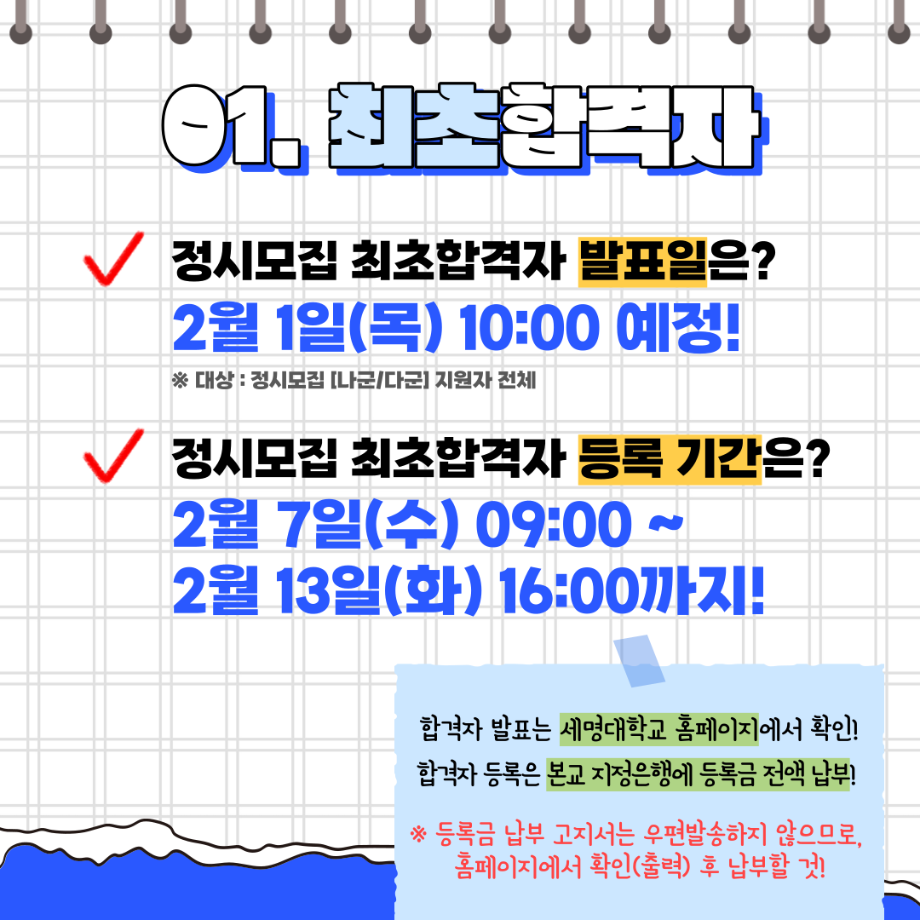 본문 시작 홈으로 SMIT 소식 SMIT 소개 SMIT 교육 SMIT 취업 SMIT 소식 SMIT 입학 홈페이지가이드 갤러리 공지사항 갤러리 경진대회 동아리 갤러리 페이스북 트위터 프린트 세명대학교 2024학년도 정시 합격자 발표 및 등록 일정 총정리💡 스마트IT학부 2823 2024-01-25 세명대학교 2024학년도 정시 합격자 발표 및 등록 일정 총정리💡 안녕하세요. 세명대학교 스마트IT학부입니다. 2024학년도 정시 합격자 발표 및 등록 일정 총정리입니다 😍 정시 발표 및 등록 일정 꼭 확인 하셔서 차질 없으시길 바랍니다. 😊 3월에 세명대학교 스마트IT학부에서 꼭 만나요🥰 목록 이전동계방학 특별활동 “정보처리기사 자격증 특강” 실시!📚 다음 2024학년도 꿈설계학기 라인업 ✨ 담당부서 : 스마트IT학부 담당자 : - 연락처 : 043-649-1275 최종수정일 : 2024-10-26 만족도조사 만족도 조사 이 페이지에서 제공하는 정보에 대하여 만족하시나요? 매우만족 만족 보통 불만족 매우불만족