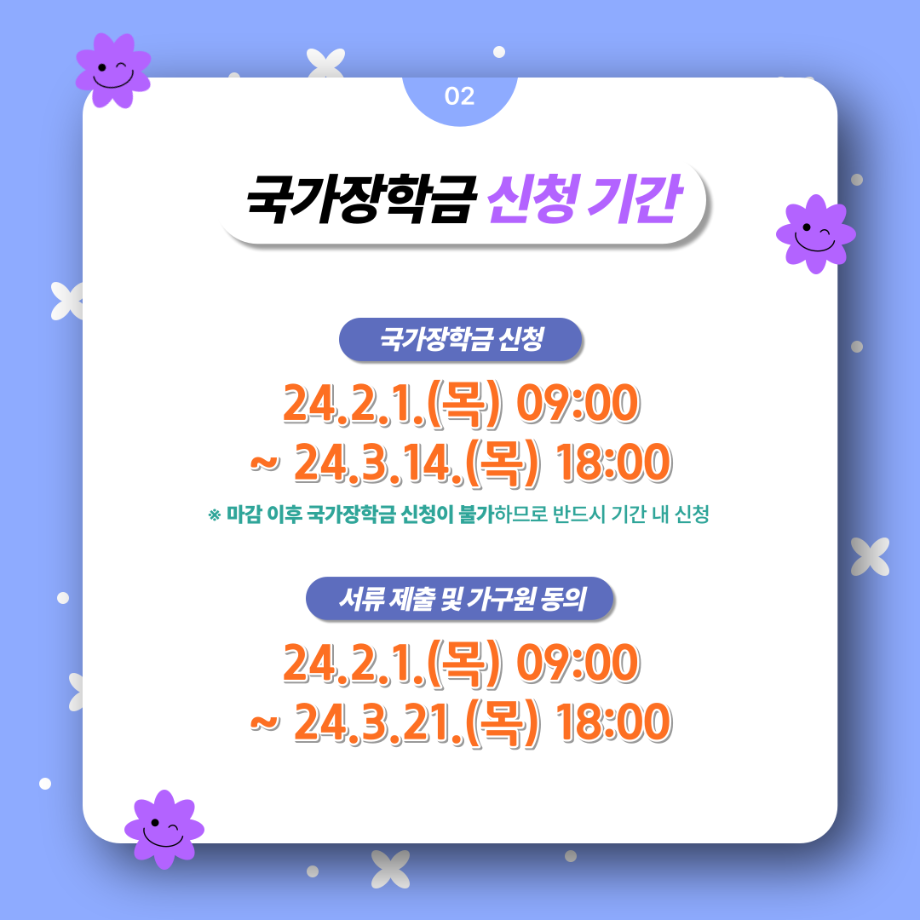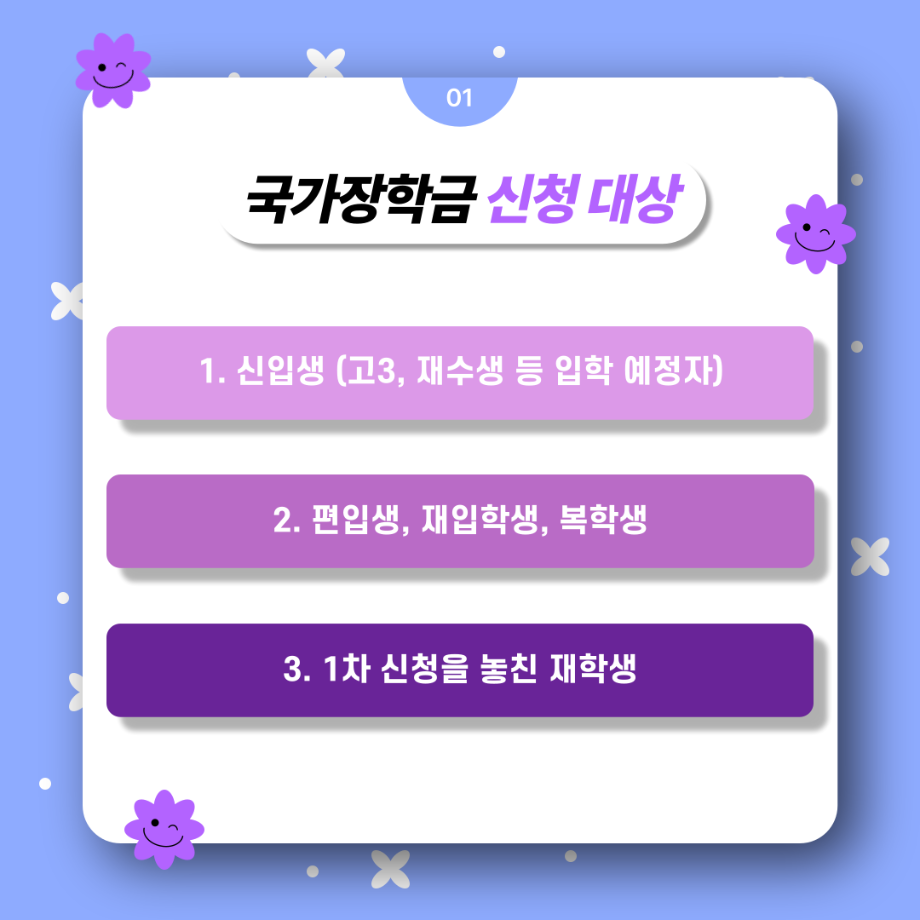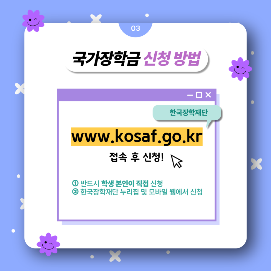 본문 시작 홈으로 SMIT 소식 SMIT 소개 SMIT 교육 SMIT 취업 SMIT 소식 SMIT 입학 홈페이지가이드 갤러리 공지사항 갤러리 경진대회 동아리 갤러리 페이스북 트위터 프린트 여러분! 국가장학금 2차 신청하세요! 스마트IT학부 2750 2024-02-23 여러분! 국가장학금 2차 신청하세요! ✔ 내가 세명대학교 신입생이라면! ✔ 내가 편입생, 재입학생, 복학생이라면! ✔ 내가 1차 신청을 놓쳤다면! 📌 24년 2월 1일(목) 09:00부터 3월 24일(목) 18:00까지 ✨ 한국장학재단 사이트에서 신청하세요! 목록 이전2024년도 꿈설계학기 2일차 다음 2024학년도 추가모집 주요사항 담당부서 : 스마트IT학부 담당자 : - 연락처 : 043-649-1275 최종수정일 : 2024-10-26 만족도조사 만족도 조사 이 페이지에서 제공하는 정보에 대하여 만족하시나요? 매우만족 만족 보통 불만족 매우불만족