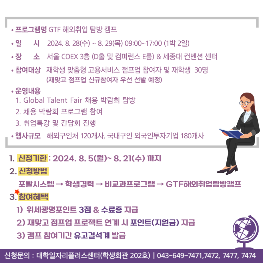본문 시작 홈으로 SMIT 소식 SMIT 소개 SMIT 교육 SMIT 취업 SMIT 소식 SMIT 입학 홈페이지가이드 갤러리 공지사항 갤러리 경진대회 동아리 갤러리 페이스북 트위터 프린트 📢 GTF해외취업탐방&캠프 안내 스마트IT학부 2359 2024-08-05 (확성기)안녕하세요, 대학일자리플러스센터 재맞고팀 입니다. 현재, 8/28(수)~29(목)에 진행되는 'GTF해외취업탐방&캠프' 신청자 모집 중에 있습니다. 본 프로그램은 1박 2일로 진행되며, 위세광명포인트 지급 및 유고결석계가 발급됩니다. 또한, 재학생맞춤형고용서비스 점프업 프로젝트 연계 시 프로그램 종료 후 지원금(20만원) 지급 예정입니다. 많은 관심과 참여 부탁드립니다!! 목록 이전★2024학년도 2학기 팝업스토어 신청자 모집★ 다음 [보도자료] 세명대학교 스마트IT학부 "드론코더 300 프로젝트 방학프로그램" 담당부서 : 스마트IT학부 담당자 : - 연락처 : 043-649-1275 최종수정일 : 2024-10-26 만족도조사 만족도 조사 이 페이지에서 제공하는 정보에 대하여 만족하시나요? 매우만족 만족 보통 불만족 매우불만족