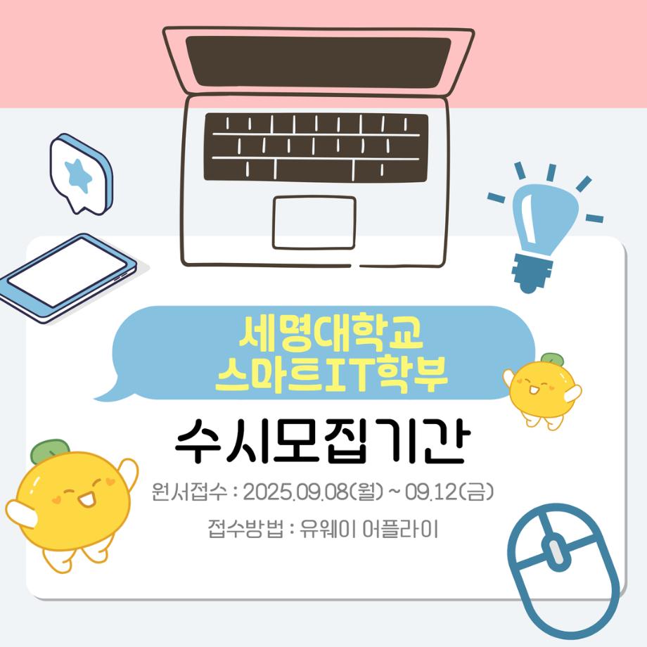 본문 시작 홈으로 SMIT 소식 SMIT 소개 SMIT 교육 SMIT 취업 SMIT 소식 SMIT 입학 홈페이지가이드 갤러리 공지사항 갤러리 경진대회 동아리 갤러리 페이스북 트위터 프린트 ◈ 스마트IT학부의 모든것🎶 ◈ 스마트IT학부 1731 2025-08-12 📢 스마트IT학부의 모든것!! - 내가알려줄게 🎉🎉 #세명대학교 #스마트IT학부 #드론 #카드뉴스 목록 이전2025 스마트IT학부 일보 다음 2024-후기 대학원 박사 학위수여식 담당부서 : 스마트IT학부 담당자 : - 연락처 : 043-649-1275 최종수정일 : 2024-10-26 만족도조사 만족도 조사 이 페이지에서 제공하는 정보에 대하여 만족하시나요? 매우만족 만족 보통 불만족 매우불만족