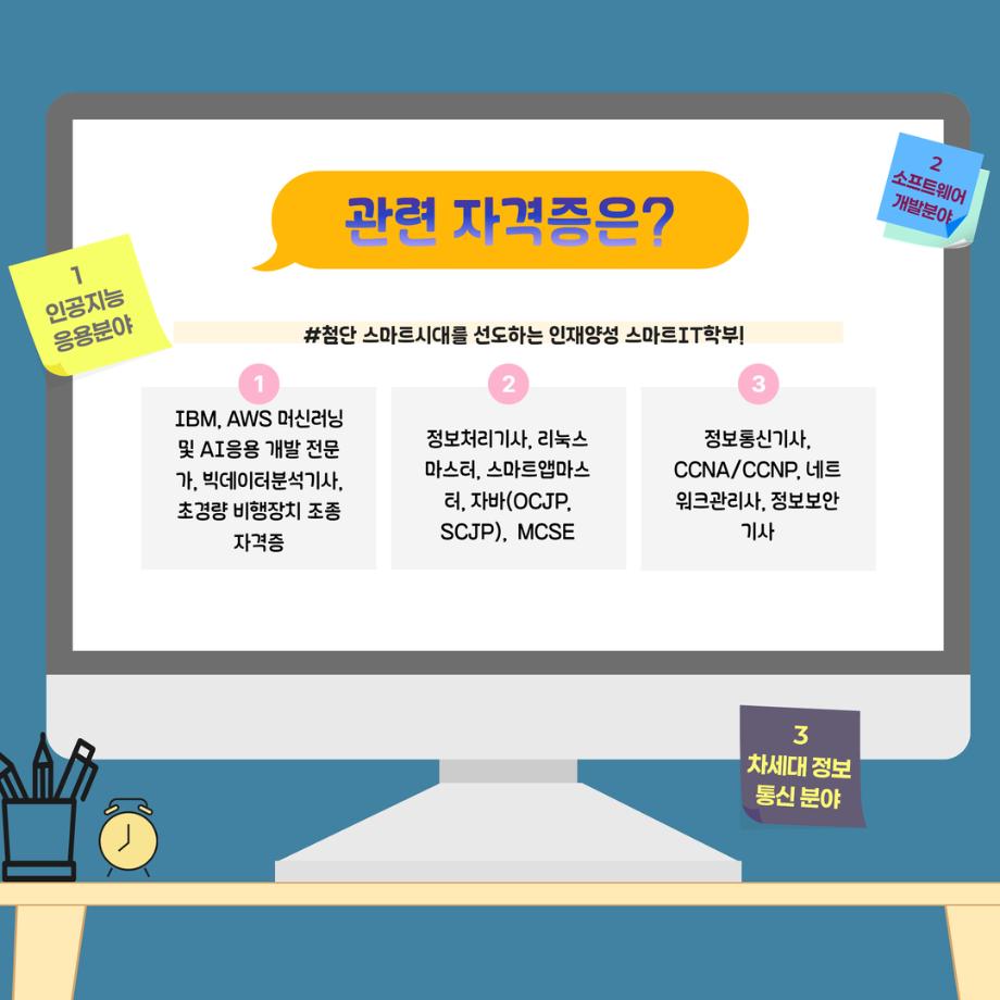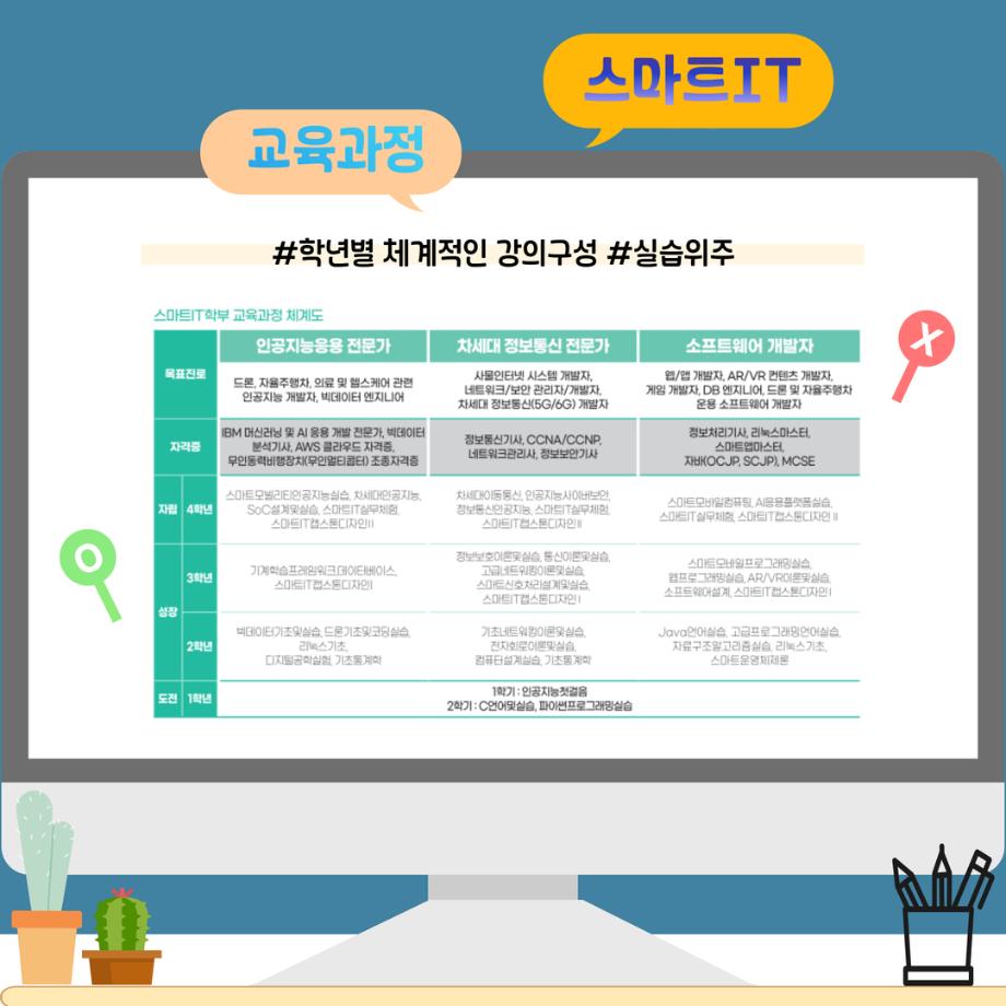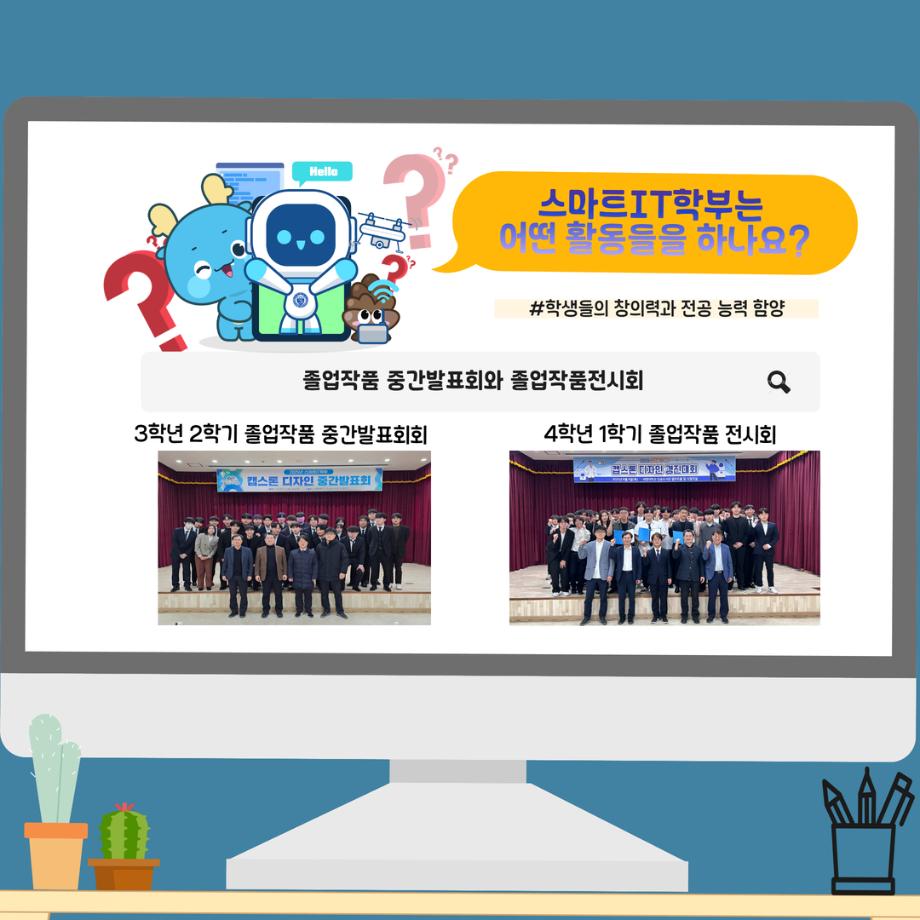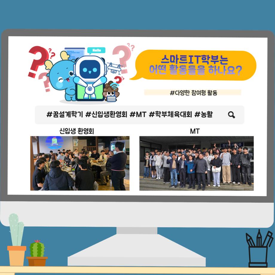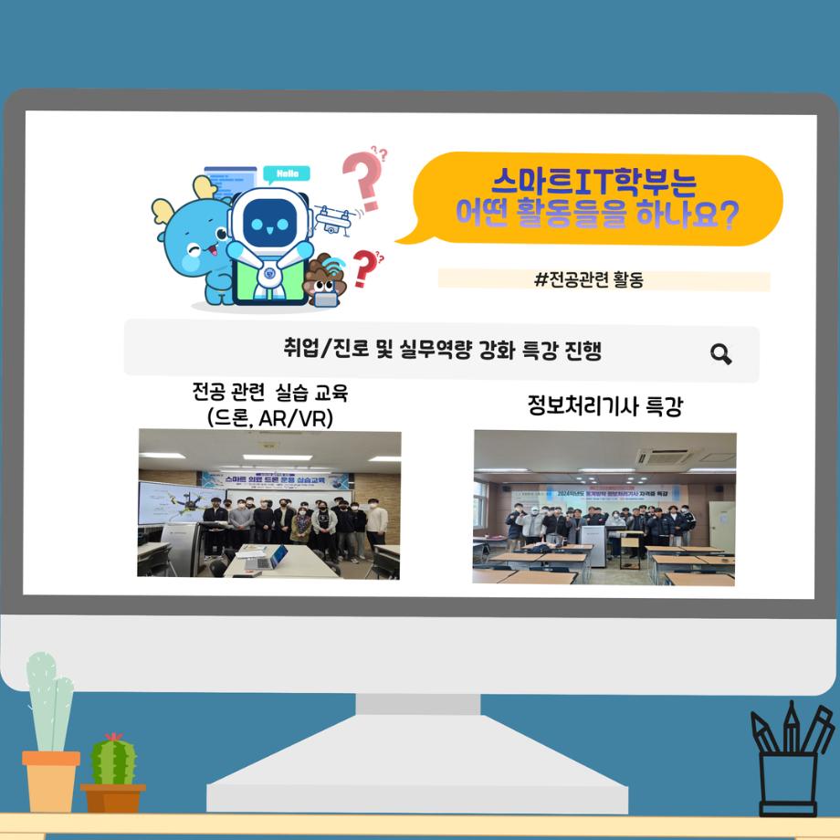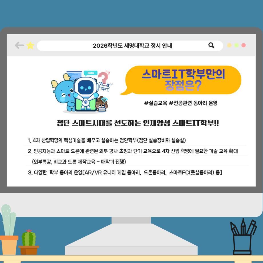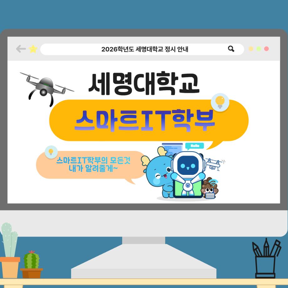 본문 시작 홈으로 SMIT 소식 SMIT 소개 SMIT 교육 SMIT 취업 SMIT 소식 SMIT 입학 홈페이지가이드 갤러리 공지사항 갤러리 경진대회 동아리 갤러리 페이스북 트위터 프린트 📢2026 정시모집 + 스마트IT학부의 각종활동📢 스마트IT학부 920 2025-12-30 📢2026 정시모집 + 스마트IT학부의 각종활동📢 목록 이전2026 정시모집 안내 다음 (축) 신규 임용 신용제 교수 담당부서 : 스마트IT학부 담당자 : - 연락처 : 043-649-1275 최종수정일 : 2024-10-26 만족도조사 만족도 조사 이 페이지에서 제공하는 정보에 대하여 만족하시나요? 매우만족 만족 보통 불만족 매우불만족