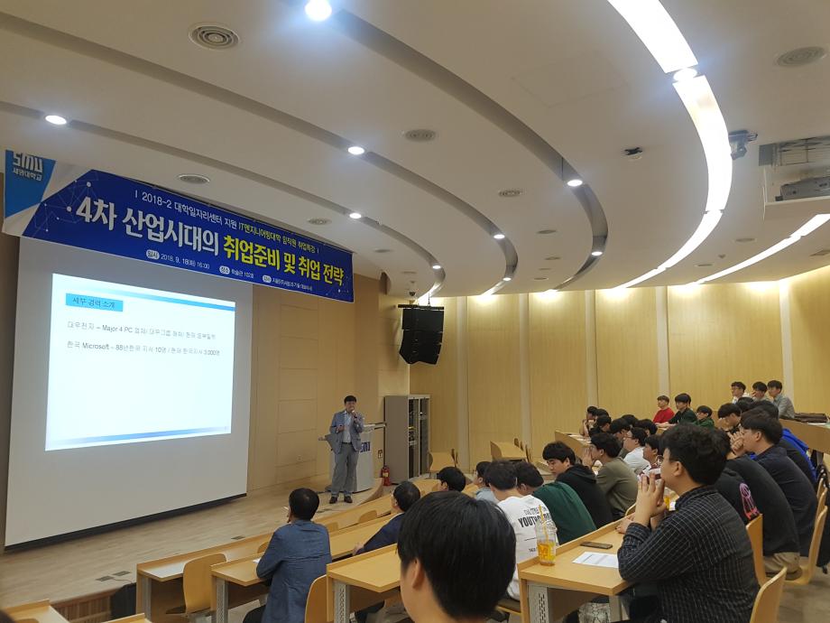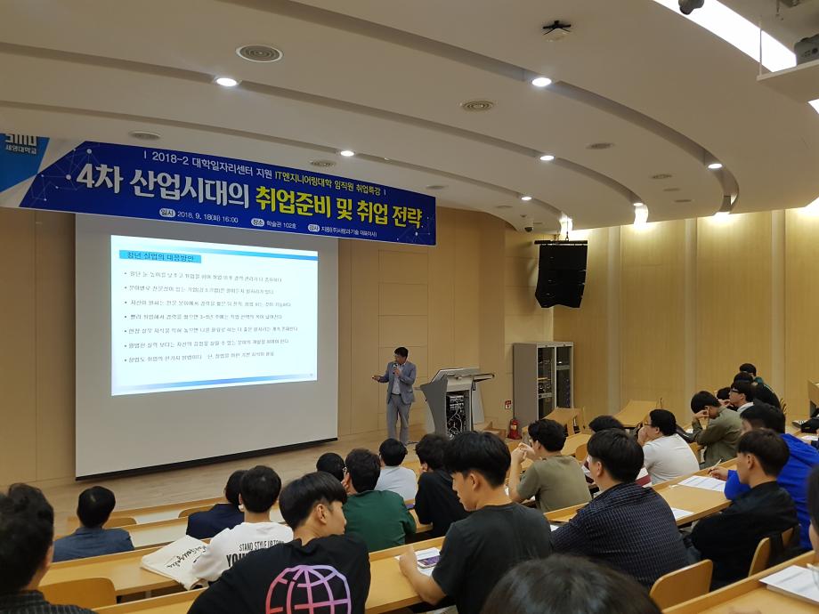 정보통신학부에서는 2018학년도 IT엔지니어링대학 임직원 취업특강으로 09월 18일(화) (주)사람과 기술 대표이사를 모시고 4차 산업시대의 취업준비 및 취업전략에 관한 특강을 진행하였다. 특강은 학술관 102호에서 진행되었으며 사회 환경의 변화와 청년실업의 문제점 분석, 직업 및 회사 선택의 기준제시, 기업이 원하는 인재상 분석 등의 내용으로 진행되었다. 이 특강을 통해 재학생들은 취업준비에 필요한 견문을 넓힐 수 있었고 전문지식 및 현장실무능력의 중요성을 깨달을 수 있게 되었다.