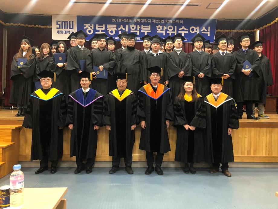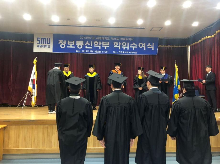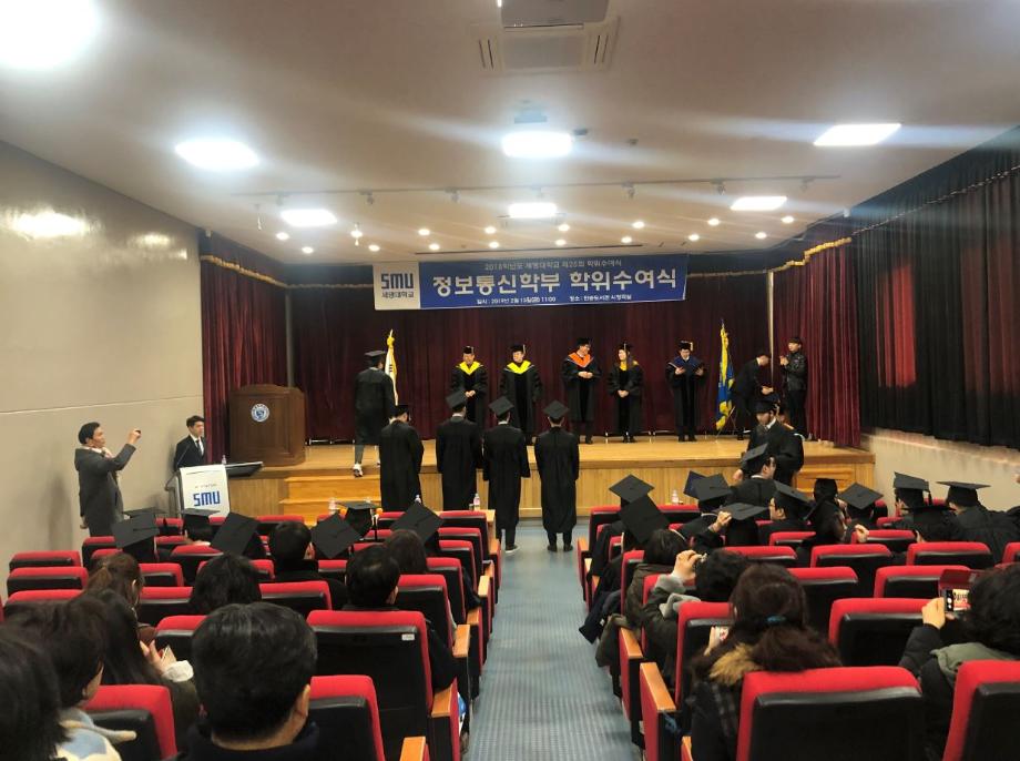 본문 시작 홈으로 SMIT 소식 SMIT 소개 SMIT 교육 SMIT 취업 SMIT 소식 SMIT 입학 홈페이지가이드 갤러리 공지사항 갤러리 경진대회 동아리 갤러리 페이스북 트위터 프린트 2018학년도 전기 학위수여식 정보통신학부 6480 2019-02-20 정보통신학부에서는 02월 15일(금) 민송도서관 시청각실에서 2018학년도 전기 학위수여식을 개최하였다. 정보통신학부에서 총 54명의 졸업생이 학위를 수여받았으며 학부수석 1명, 공로상 2명의 학생들이 상장을 받았다. 이용걸 총장은 축사에서 졸업생에게 “진정한 지성인으로 거듭난 졸업생들이 세상을 밝게 비추는 위세광명의 인재로 활약하게 될 날을 기대한다”며 “졸업생들의 앞날에 무궁한 축복과 발전이 있기를 기원한다”고 전했다. 목록 이전2018학년도 동계방학 중 정보처리기사 자격증 특강 진행 다음 2019학년도 정보통신학부 신입생 '꿈 설계학기' 담당부서 : 스마트IT학부 담당자 : - 연락처 : 043-649-1275 최종수정일 : 2024-10-26 만족도조사 만족도 조사 이 페이지에서 제공하는 정보에 대하여 만족하시나요? 매우만족 만족 보통 불만족 매우불만족