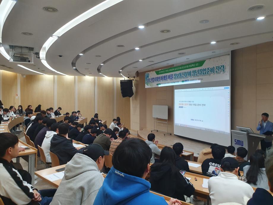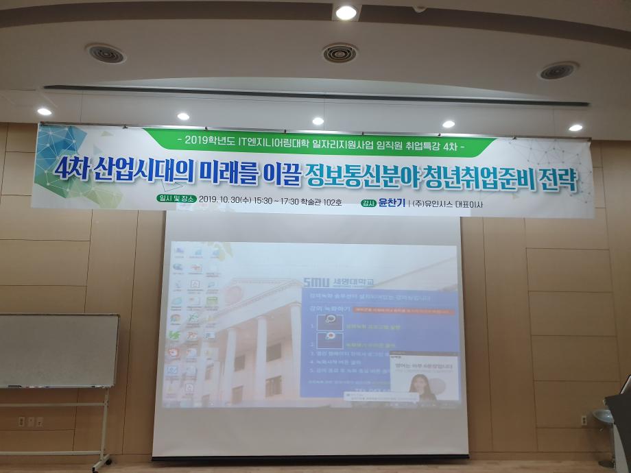 정보통신학부에서는 2019학년도 IT엔지니어링대학 임직원 취업특강으로 10월 30일(수) (주)유인시스 대표이사를 모시고 ‘4차 산업시대의 미래를 이끌 정보통신분야 청년취업준비 전략’에 관한 특강을 진행하였다. 특강은 학술관 102호에서 진행되었으며 4차 산업의 제반기술 및 미래, 정보통신분야의 전망, 정보시스템 개발 및 운영, 그리고 성공적인 취업준비전략 등의 내용으로 진행되었다. 이 특강을 통해 재학생들은 취업준비에 필요한 견문을 넓힐 수 있었고 전문지식 및 현장실무능력의 중요성을 깨달을 수 있게 되었다.