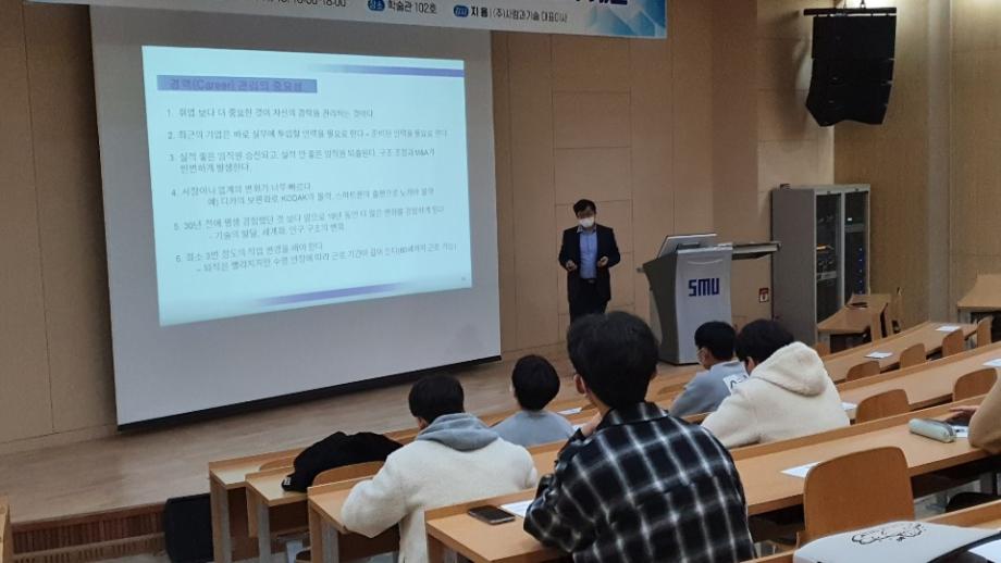4차 산업시대의 취업준비 및 취업전략에 관한 특강을 진행하였다. 특강은 학술관 102호에서 진행되었으며, 사회 환경의 변화와 직업 및 회사 선택의 기준제시, 자기 개발 및 경력 관리 방법 제시 등의 내용으로 진행되었다. 이 특강을 통해 재학생들은 취업준비에 필요한 견문을 넓힐 수 있었고 전문지식 및 현장실무능력의 중요성을 깨달을 수 있게 되었다.