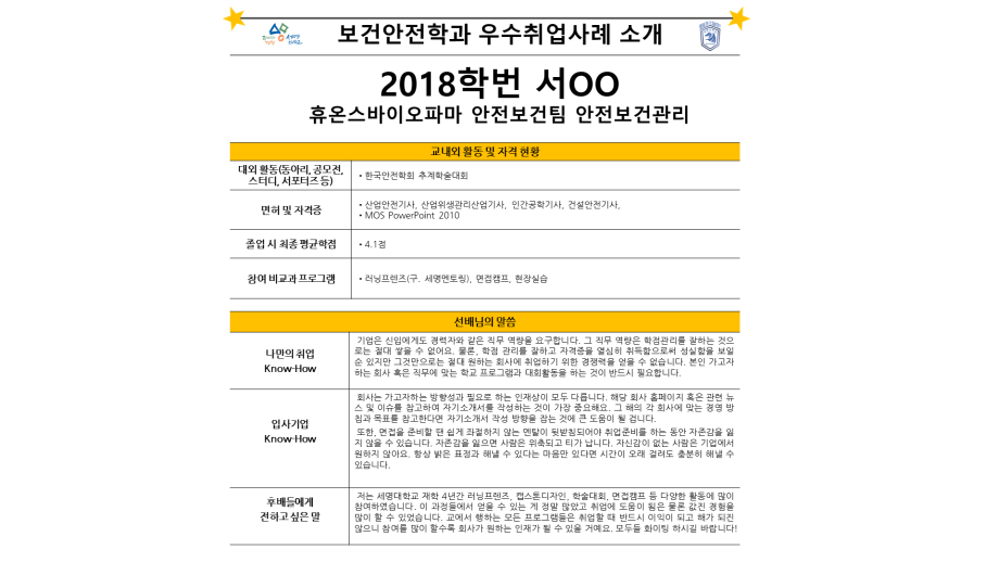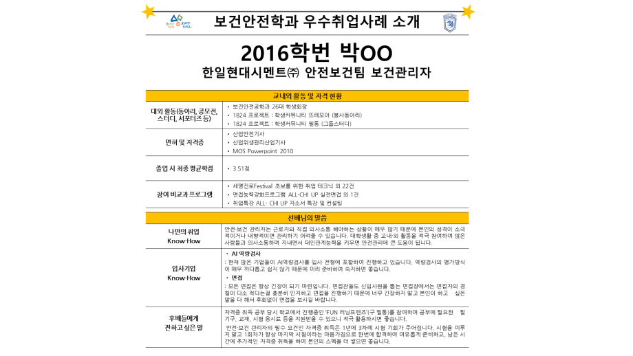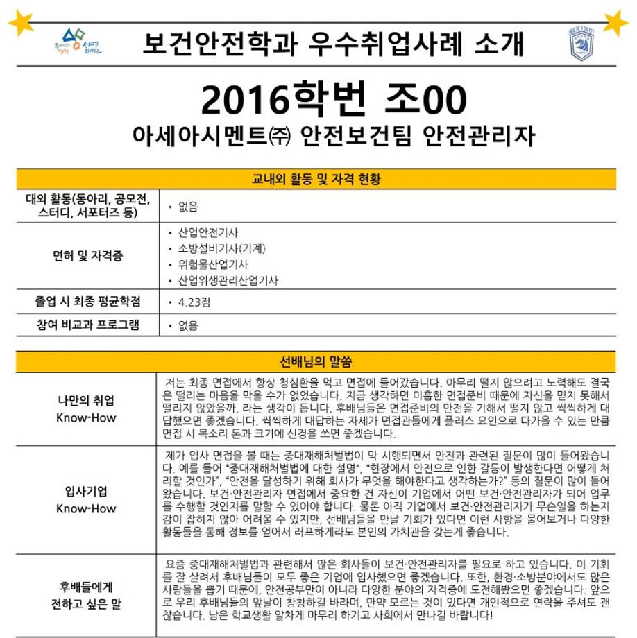 본문 시작 홈으로 커뮤니티 학과소개 진로 및 취업 교수소개 학과과정 커뮤니티 홈페이지가이드 포토갤러리 학과공지 학사일정 포토갤러리 학생회 학과영상 보건안전학과 인스타 보건안전학과 블로그 포토갤러리 페이스북 트위터 프린트 보건안전학과 우수취업사례 보건안전학과 2711 2024-09-09 보건안전학과 우수취업사례 목록 이전제6회 현장실습 우수사례 수기 공모전 학과 학생 수상 다음 한국설비안전학회 우수논문상 담당부서 : 보건안전학과 담당자 : - 연락처 : 043-649-1777 최종수정일 : 2024-10-26 만족도조사 만족도 조사 이 페이지에서 제공하는 정보에 대하여 만족하시나요? 매우만족 만족 보통 불만족 매우불만족