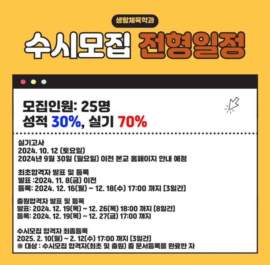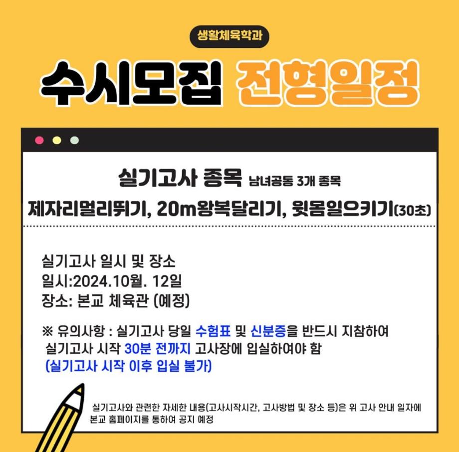 본문 시작 홈으로 커뮤니티SNS 학과소개 진로취업사례 입학안내 교육과정 커뮤니티SNS 홈페이지가이드 학과행사갤러리 학과공지 열린정보SNS 학과동아리 학과행사갤러리 학과MOU 학생회조직도 학과연혁 동문회조직도 학과행사갤러리 페이스북 트위터 프린트 생활체육학과 2025학년도 수시모집 실기고사 생활체육학과 2527 2024-10-07 생활체육학과 2025학년도 수시모집 실기고사 목록 이전2024학년도 1학년 축구 수업 팀별 단체사진 다음 2024학년도 총장배 대비 축구, 피구 연습 담당부서 : 생활체육학과 담당자 : - 연락처 : 043-469-1289 최종수정일 : 2024-10-26 만족도조사 만족도 조사 이 페이지에서 제공하는 정보에 대하여 만족하시나요? 매우만족 만족 보통 불만족 매우불만족