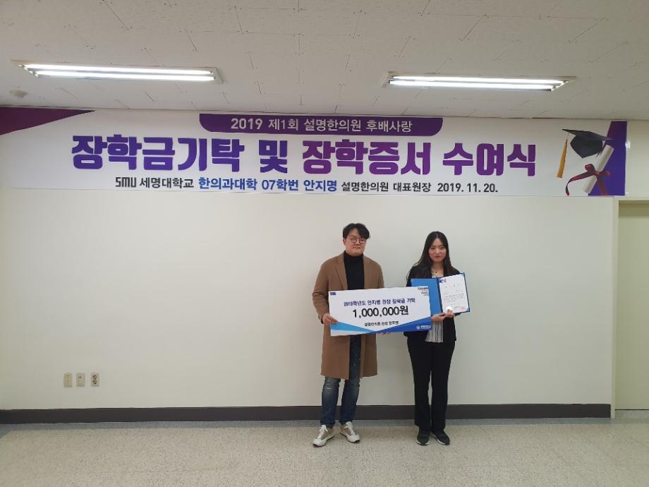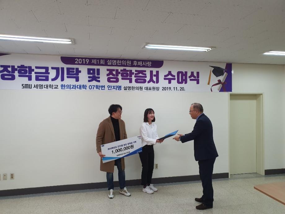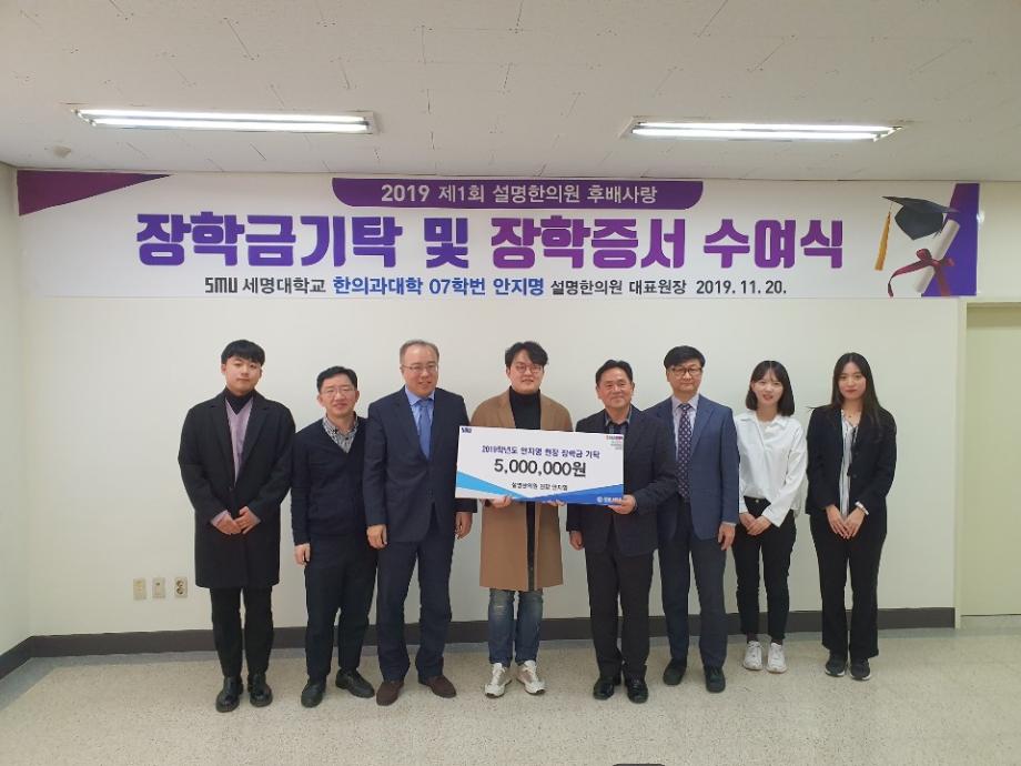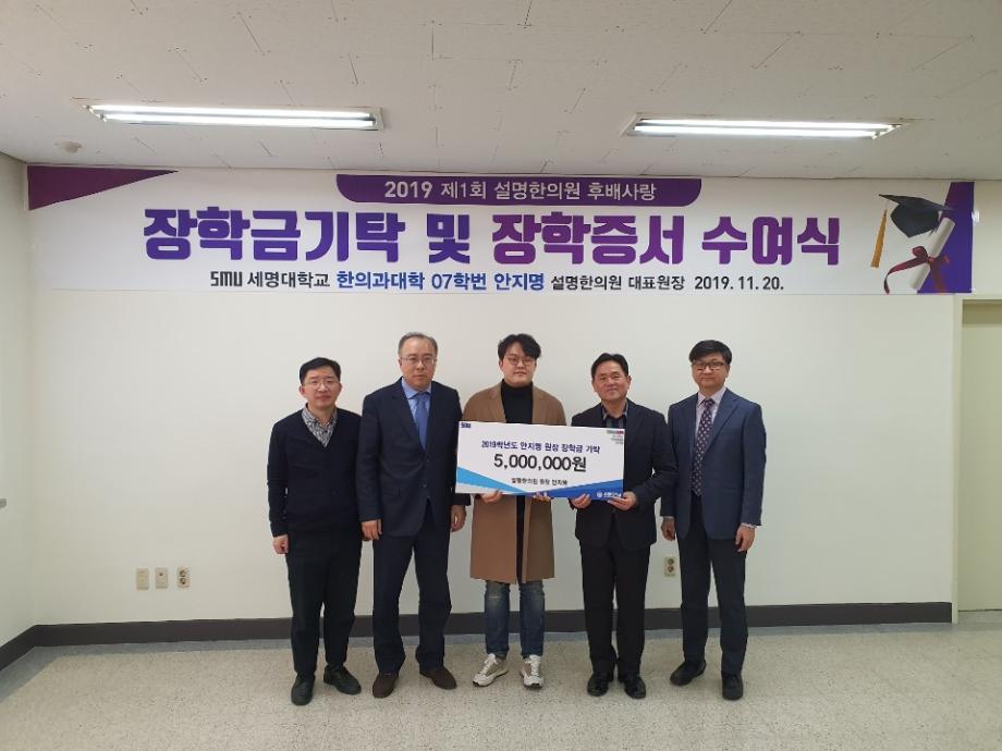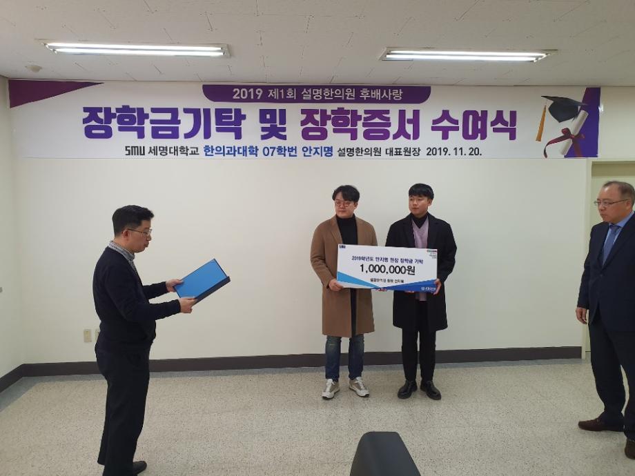 설명한의원 대표 안지명 원장은 세명대학교 한의과대학에 장학금 500만원을 기탁하고, 김태훈,박수진,원지현 학생에게 장학증서와 함께 장학금 100만원씩을 각각 전달했다.