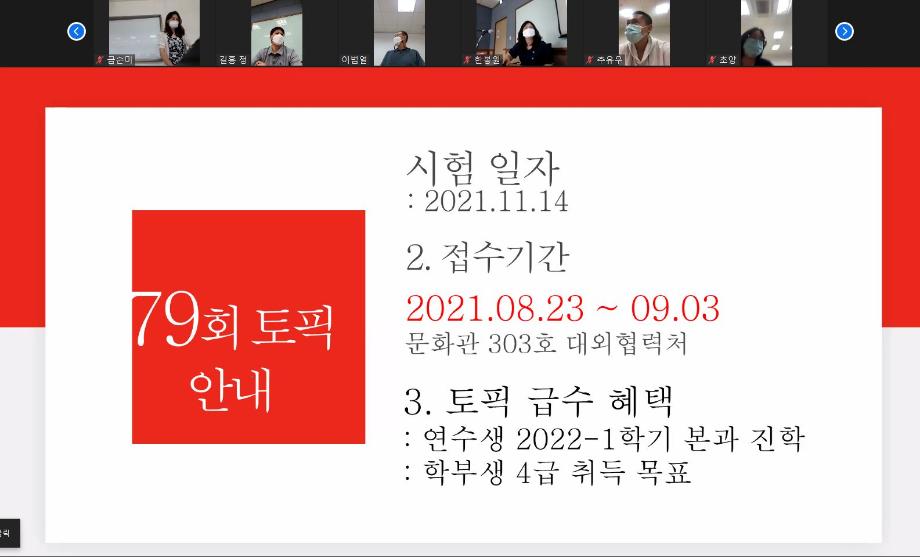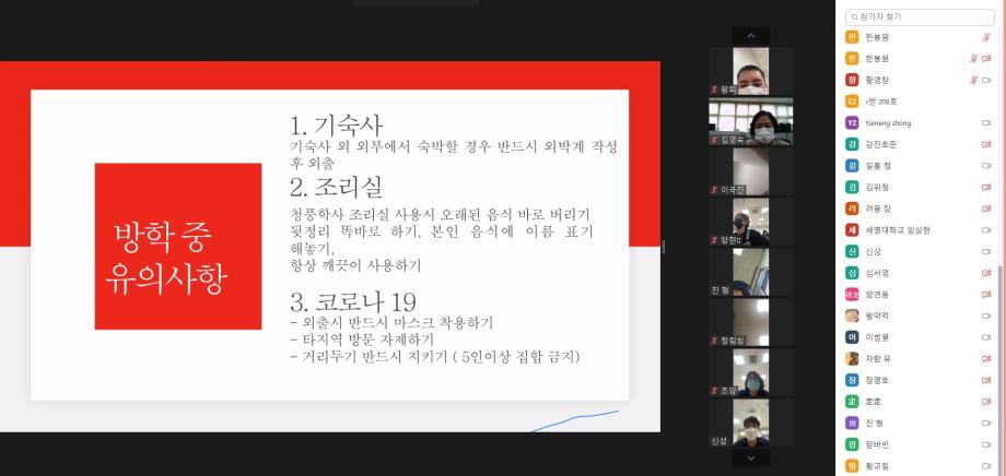 본문 시작 2021-여름 한국어연수생 종강식 국제교육원 2328 2021-08-13 2021-여름 한국어연수생 종강식 코로나19로 인해 비대면 종강식을 실시하였습니다. 목록 이전2021-여름 생활적응지원프로그램 다음 2021-가을학기 신입생 오리엔테이션 담당부서 : 국제교육원 담당자 : - 연락처 : 043-649-1185 최종수정일 : 2024-10-26 만족도조사 만족도 조사 이 페이지에서 제공하는 정보에 대하여 만족하시나요? 매우만족 만족 보통 불만족 매우불만족