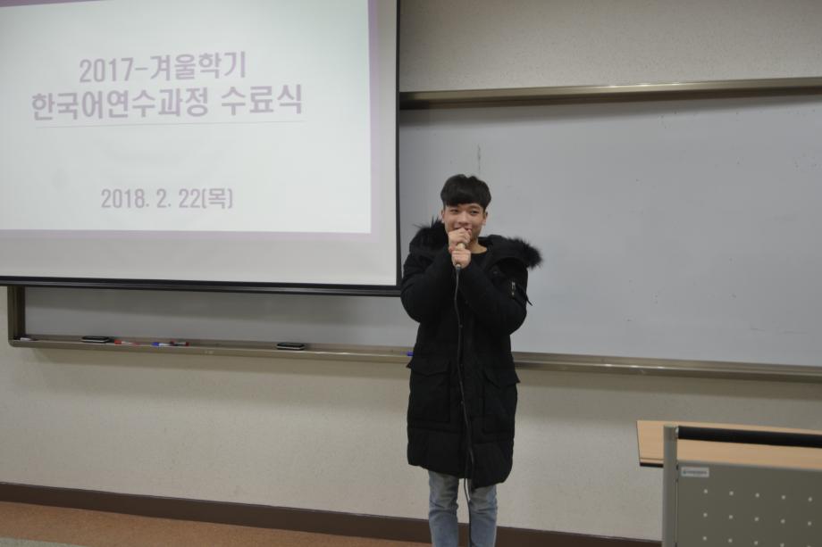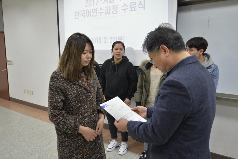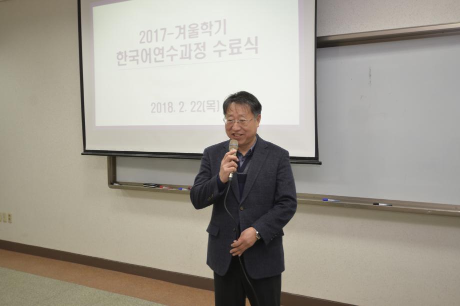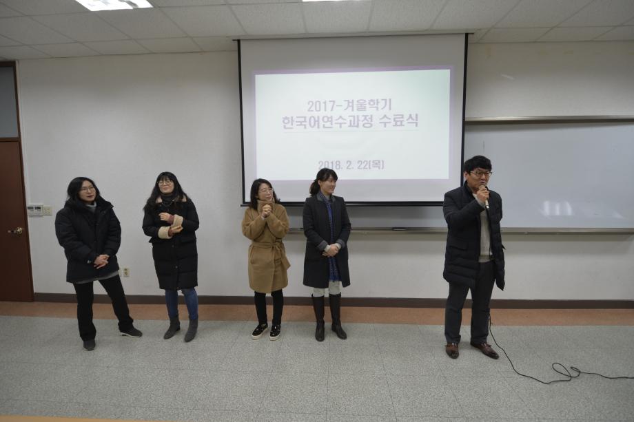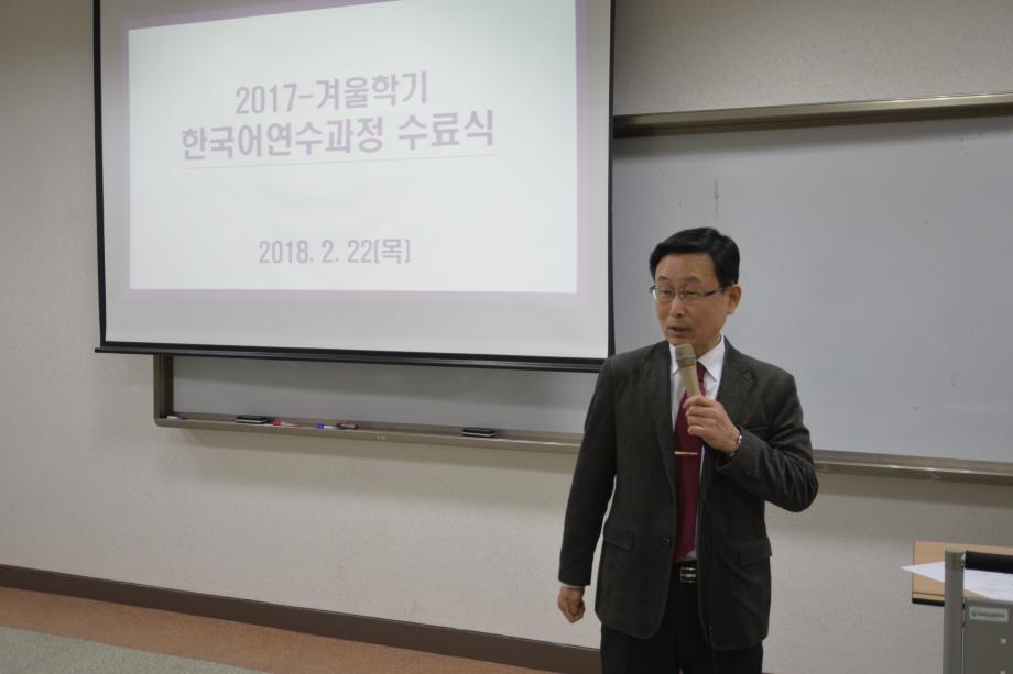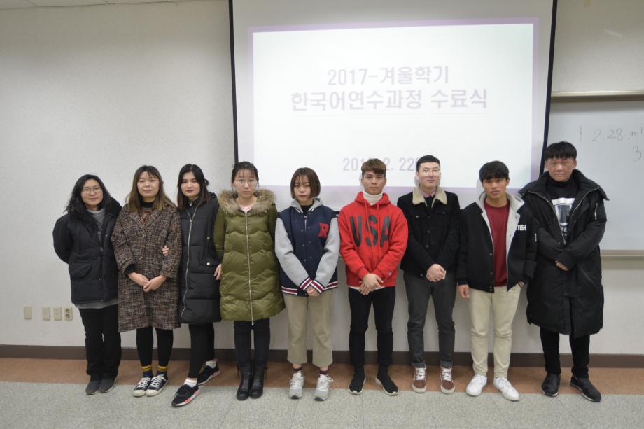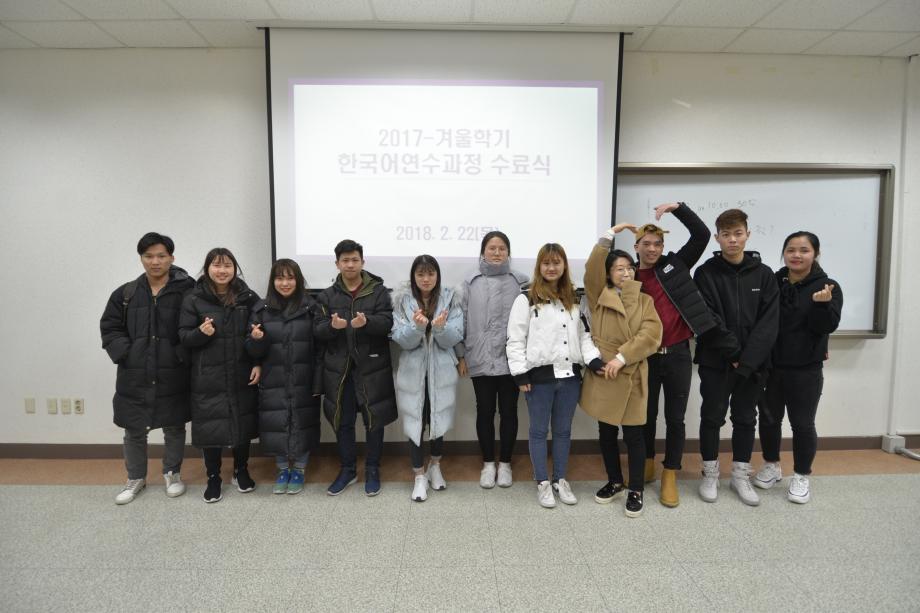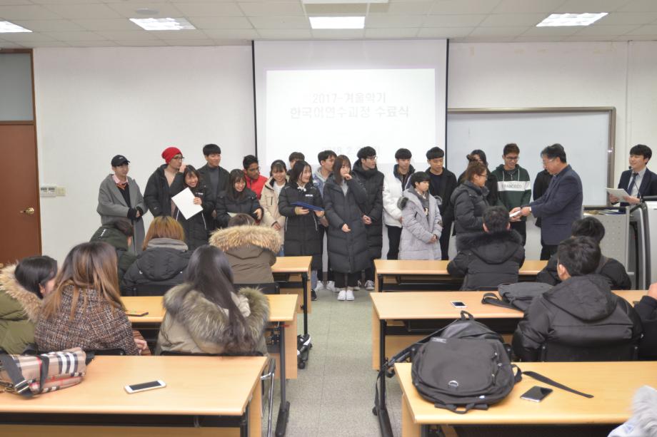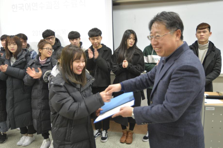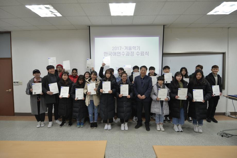 본문 시작 2017년 겨울학기 한국어 연수과정 수료식 국제교육원 5407 2018-02-22 2018년 02월 22일 국제교육원(처장 김창한)에서는 2017-겨울학기 한국어 연수과정 수료식을 진행하였습니다. 연수생들은 한 학기동안 많은 노력을 통해 TOPIK(한국어능력시험) 자격증 취득, 우수학생에 선정되는 등 학업성취를 이루었습니다. 본과에 진학하는 학생들과 연수과정이 남은 학생들 모두 더욱 정진하는 자세를 통해 발전하기를 기원합니다. 목록 이전2017 겨울학기 한국어연수생 설맞이 간담회 다음 2018 봄학기 한국어 연수과정 개강식 담당부서 : 국제교육원 담당자 : - 연락처 : 043-649-1185 최종수정일 : 2024-10-26 만족도조사 만족도 조사 이 페이지에서 제공하는 정보에 대하여 만족하시나요? 매우만족 만족 보통 불만족 매우불만족