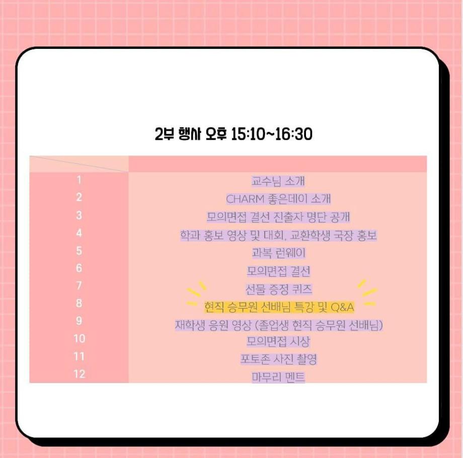 이외에도 참좋은데이에 관한 궁금한점이 생기시면 언제든 편하게 세명대학교 항공서비스학과 카카오톡 오픈채팅방을 통해 연락주시면 자세히 설명드리겠습니다 😊🤍