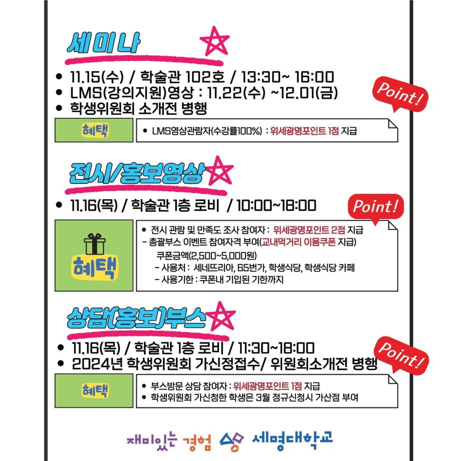 참여만으로도 위세광명 포인트를 얻을 수 있는 기회이기도 하니 재학생분들의 많은 참여와 관심 부탁드립니다 🩵