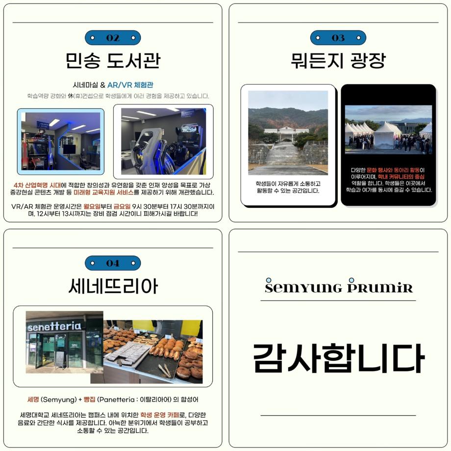 이번 카드뉴스에는 세명대학교의 아름다운 캠퍼스를🏫 담아보았습니다! 주요 시설과 명소를 소개하며, 학생들과 방문객들이 세명대학교의 매력을 알 수 있는 계기가 되면 좋겠습니다!