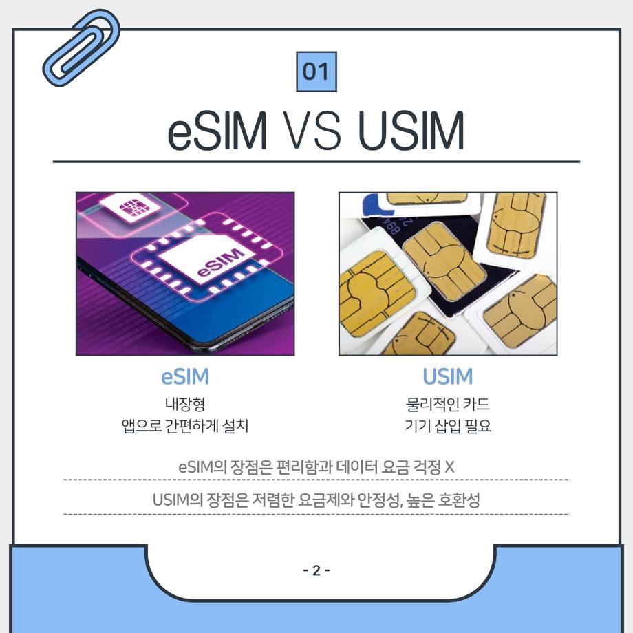 이번 카드뉴스에서는 이심(eSIM)과 유심(USIM)의 차이점을 간단히 정리했습니다. ☺ 유심은 물리적인 카드, 이심은 내장형 디지털 SIM으로 QR코드로 설정할 수 있습니다.