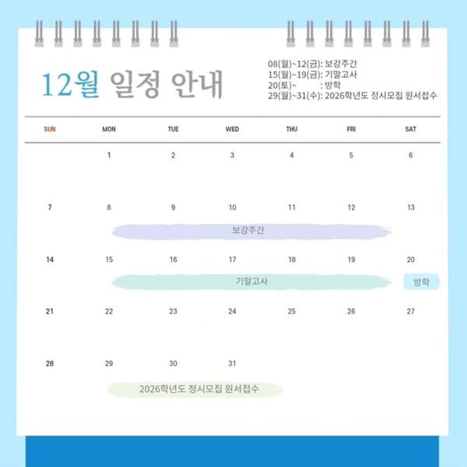 본문 시작 홈으로 커뮤니티 학과소개 입학정보 교과과정 커뮤니티 홈페이지가이드 포토갤러리 SNS 소통 공간 포토갤러리 공지사항 동아리 포토갤러리 페이스북 트위터 프린트 12월 다이어리 항공서비스학과 3051 2025-12-02 안녕하십니까 세명대학교 항공서비스학과 온라인 홍보국 💙푸르미르💙입니다. 12월에는 기말고사와 2026학년도 정시모집 원서접수가 있습니다! 확인하시고 일정에 착오 없으시길 바라겠습니다 😊 소중한 꿈을 품고 그 누구보다 높이 오를 여러분을 저희 "푸르미르" 가 항상 응원하겠습니다 ✈💙 궁금한 사항이 있으시다면 언제든지 SNS로 연락 주십시오 💬 #세명대학교 #항공서비스학과 #세명대 목록 이전세명대학교 편의시설 안내 다음 말레이시아 비자 발급