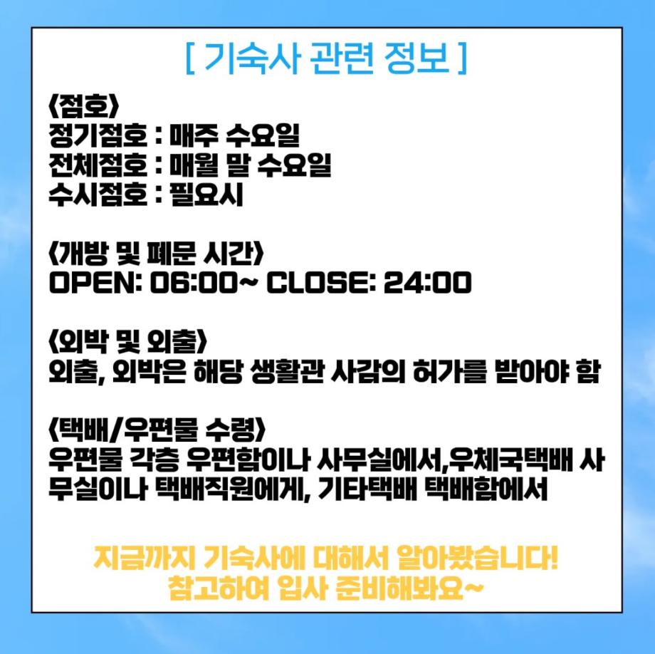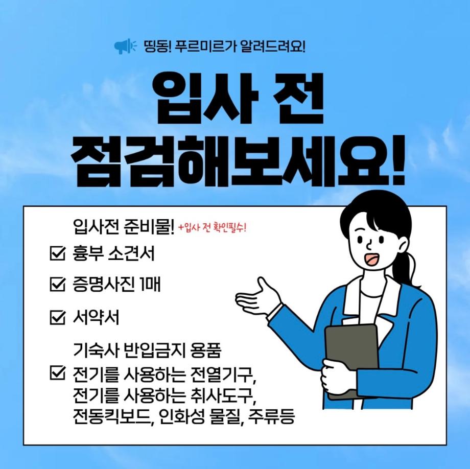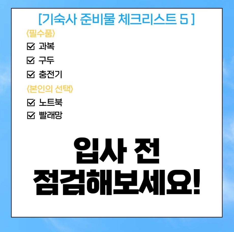 본문 시작 홈으로 커뮤니티 학과소개 입학정보 교과과정 커뮤니티 홈페이지가이드 포토갤러리 SNS 소통 공간 포토갤러리 공지사항 동아리 포토갤러리 페이스북 트위터 프린트 기숙사 체크리스트 항공서비스학과 374 2026-03-25 안녕하십니까 세명대학교 항공서비스학과 온라인 홍보국 푸르미르 입니다 오늘은 세명대학교 기숙사 입사를 앞둔 학생들을 위해 입사 전 반드시 확인해야 할 사항을 안내드립니다 입사 일정 및 세부 유의사항을 사전에 확인하여 입사에 차질이 없도록 준비해주시기 바랍니다 소중한 꿈을 품고 그 누구보다 높이 오를 여러분들을 저희 "푸르미르"가 항상 응원하겠습니다 궁금한 사항이 있으시다면 언제든지 SNS로 연락 주십시오 목록 이전2월 다이어리 다음 말레이시아 추천 맛집