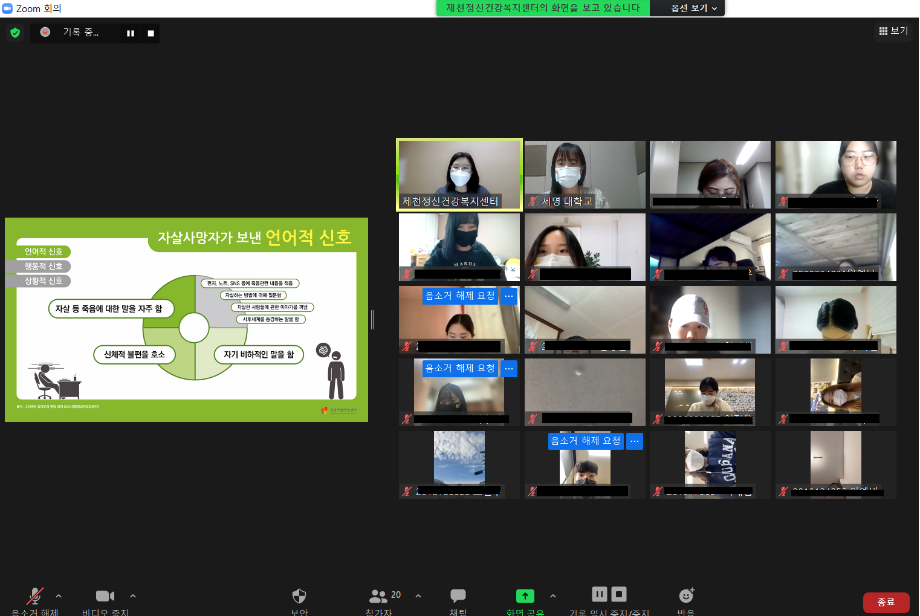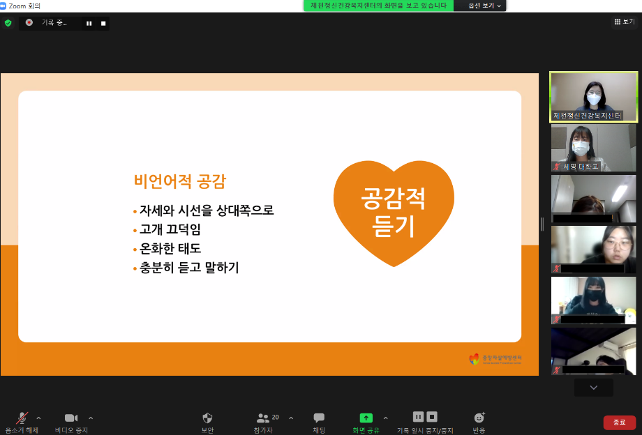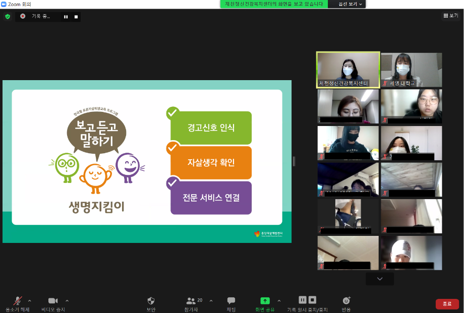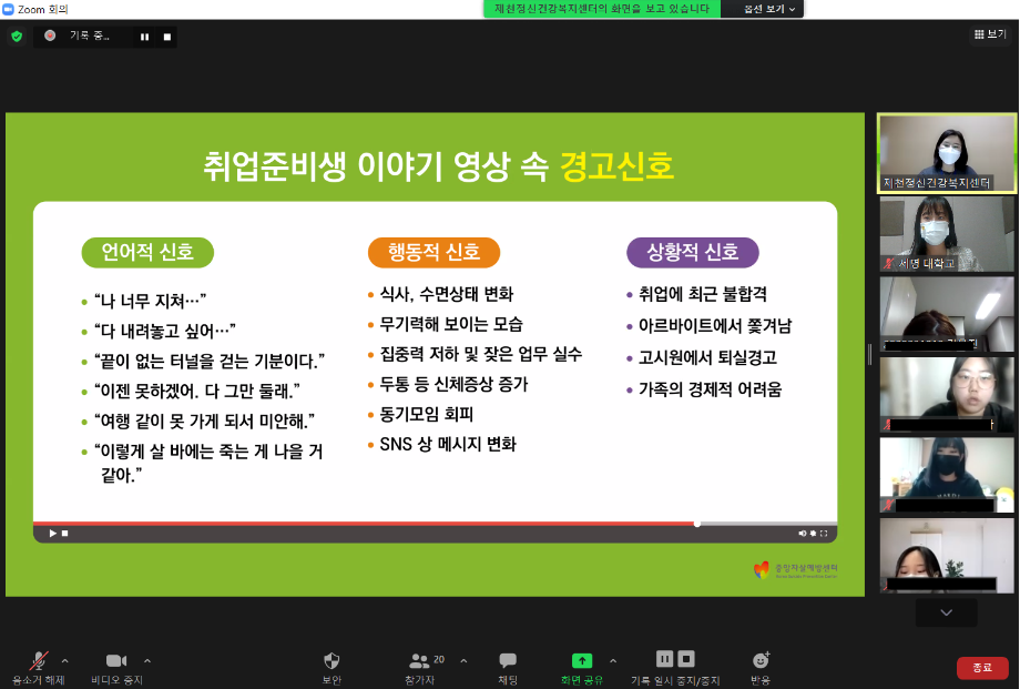 본문 시작 2021학년도 건강상담의 날 "자살예방교육"(10.26) 실시 CHARM케어상담센터 3628 2021-10-26 <건강상담의 날 "자살예방교육" 실시> 일시 : 10/26(화) 14:00~15:00 강사 : 제천시정신건강복지센터 팀장 신효진 목록 이전인권서포터즈 사회복지의날 캠페인 진행 다음 교내 폭력예방 캠페인 진행 담당부서 : CHARM케어상담센터 담당자 : - 연락처 : 043-649-1789 최종수정일 : 2024-10-26 만족도조사 만족도 조사 이 페이지에서 제공하는 정보에 대하여 만족하시나요? 매우만족 만족 보통 불만족 매우불만족