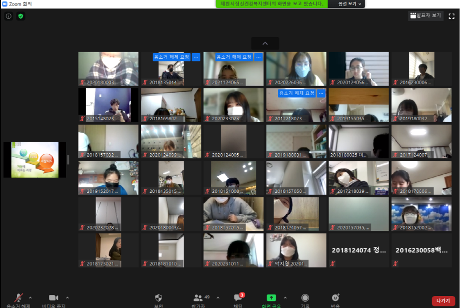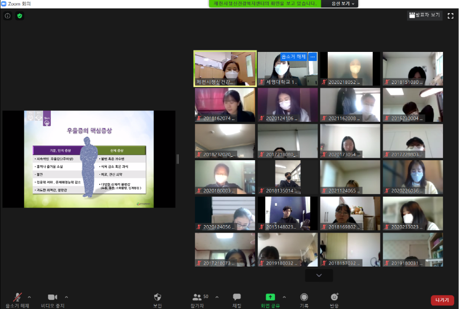 본문 시작 2021학년도 건강상담의 날 "자살예방교육" 실시 CHARM케어센터 3870 2021-04-23 <건강상담의 날 "자살예방교육" 실시> 일시 : 4/14(수) 14:00~15:30 강사 : 제천시정신건강복지센터 팀장 신효진 목록 이전2020학년도 CTI진로사고검사 재결정프로그램 "탄탄대로" (1차) 다음 2021학년도 인권서포터즈 'SMile' 발대식 담당부서 : CHARM케어상담센터 담당자 : - 연락처 : 043-649-1789 최종수정일 : 2024-10-26 만족도조사 만족도 조사 이 페이지에서 제공하는 정보에 대하여 만족하시나요? 매우만족 만족 보통 불만족 매우불만족