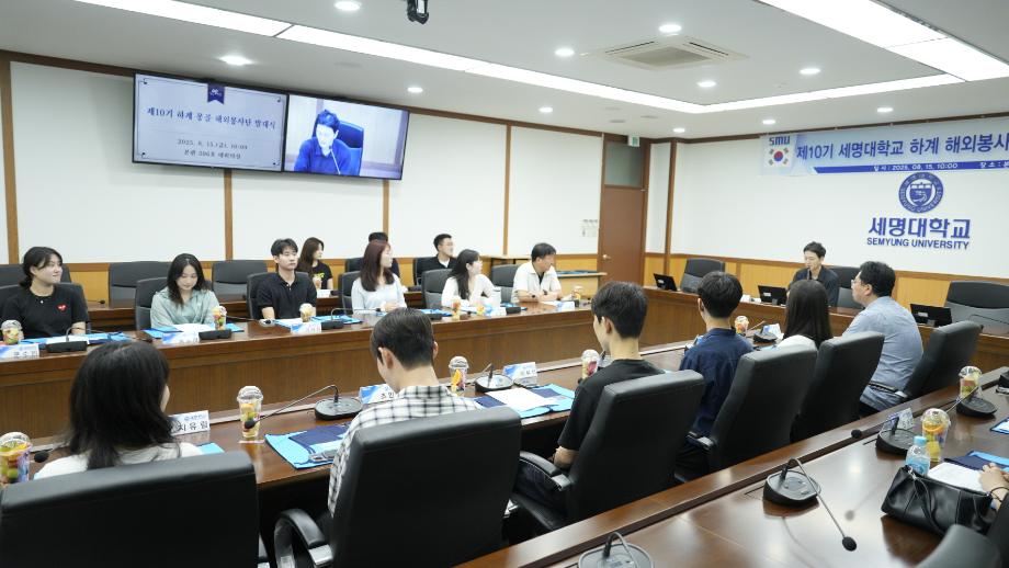 본문 시작 Photo SMU 세명소개 입학/취업 대학/대학원 학사지원 대학생활 연구/산학 기관/시설 SMU Story 소통·공감 학교기업 홈페이지가이드 학생활동 News@SMU 공지사항 보도자료 Photo SMU Media SMU 민송백일장 해카톤 경진대회 학생활동 페이스북 트위터 프린트 2025 제10기 세명대학교 하계 해외봉사단 발대식 홍보센터 2462 2025-08-15 2025 제10기 세명대학교 하계 해외봉사단 발대식 목록 이전밀어주는 위원회 제4회 무소출정식 이전2024 후기 학부 및 대학원 학위수여식 담당부서 : 홍보센터 담당자 : 홍보센터 연락처 : 043-649-1175 최종수정일 : 2024-10-26 만족도조사 만족도 조사 이 페이지에서 제공하는 정보에 대하여 만족하시나요? 매우만족 만족 보통 불만족 매우불만족
