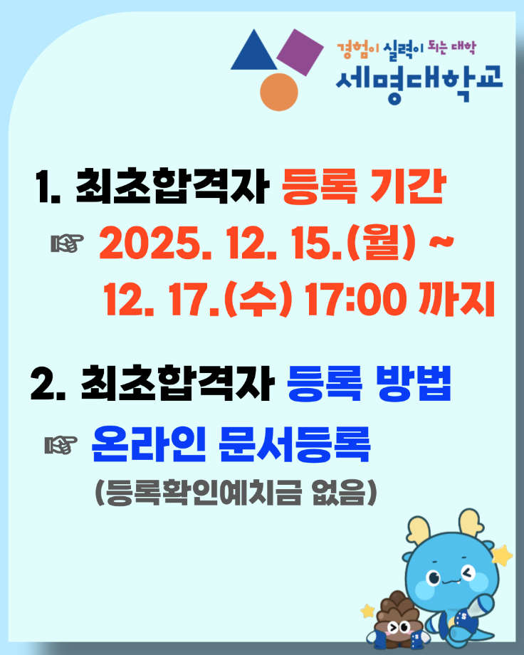 본문 시작 홈으로 커뮤니티 대학소개 학과소개 입학안내 커뮤니티 홈페이지가이드 포토갤러리 대학소식 학과소식 자료실 포토갤러리 포토갤러리 페이스북 트위터 프린트 [2026 수시] 최초합격자 등록 안내 IT엔지니어링대학 669 2025-12-15 [2026 수시] 최초합격자 등록 안내 => 자세한 내용보기 목록 이전2025 드론코더 300 프로젝트 다음 [2026 정시] 모집 안내 담당부서 : AI융합대학 담당자 : - 연락처 : 043-649-7422 최종수정일 : 2024-10-26 만족도조사 만족도 조사 이 페이지에서 제공하는 정보에 대하여 만족하시나요? 매우만족 만족 보통 불만족 매우불만족