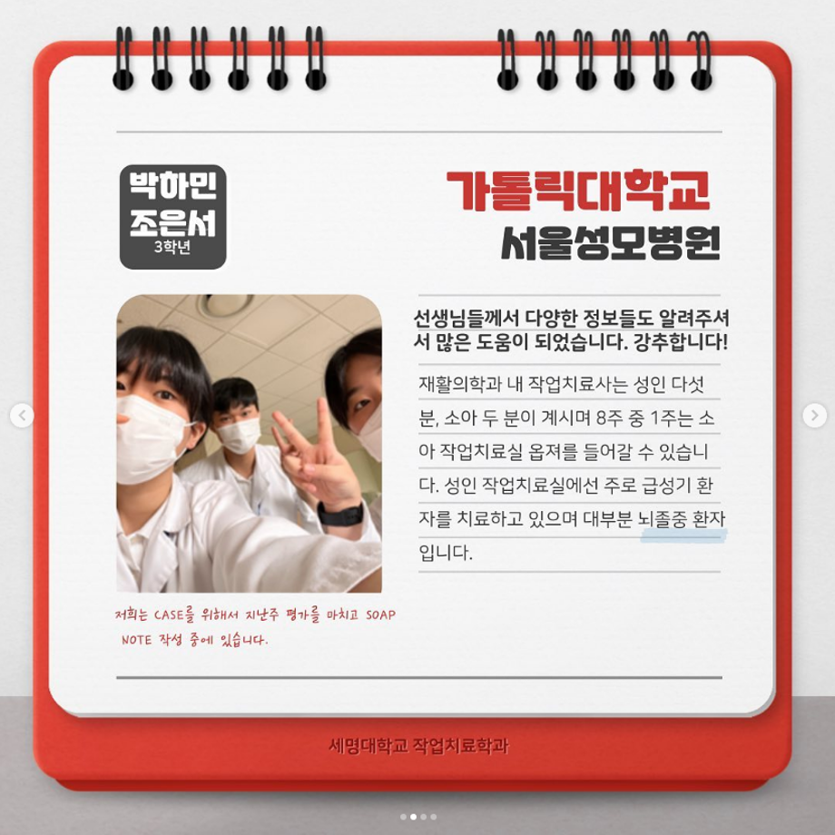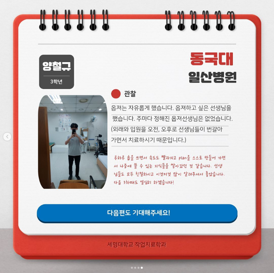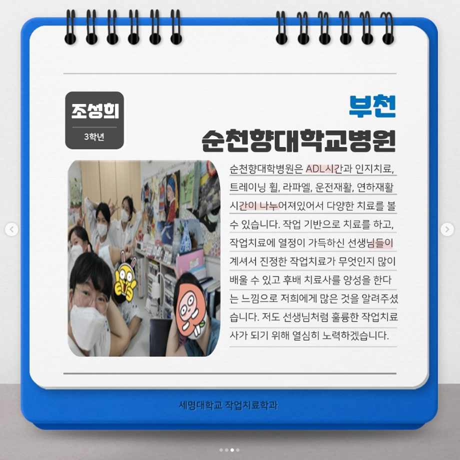 본문 시작 홈으로 커뮤니티 학과소개 진로 및 취업 학과과정 커뮤니티 SNS 홈페이지가이드 학과 소식 및 행사 학과공지 학과 소식 및 행사 대학생활 엿보기 어쩌다 출근 챌린지 학생회 동아리 통학버스 시간표 학과 소식 및 행사 페이스북 트위터 프린트 2022 실습후기모음 (아동파트 대학병원, 종합병원) 작업치료학과 4795 2022-11-01 목록 이전동아리 소개 [초코파이] 다음 동아리 소개 [지태사] 담당부서 : 작업치료학과 담당자 : - 연락처 : 043-649-1632 최종수정일 : 2024-10-26 만족도조사 만족도 조사 이 페이지에서 제공하는 정보에 대하여 만족하시나요? 매우만족 만족 보통 불만족 매우불만족