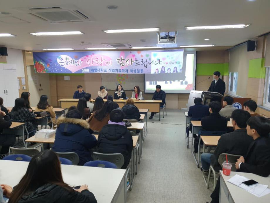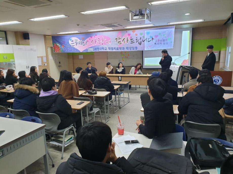 본문 시작 홈으로 커뮤니티 학과소개 진로 및 취업 학과과정 커뮤니티 SNS 홈페이지가이드 학과 소식 및 행사 학과공지 학과 소식 및 행사 대학생활 엿보기 어쩌다 출근 챌린지 학생회 동아리 통학버스 시간표 학과 소식 및 행사 페이스북 트위터 프린트 2018년도 사은회 작업치료학과 7090 2018-12-10 12월 10일, 작업치료사 국가시험을 보고 돌아온 4학년 학생들이 교수님들을 모시고 사은회를 진행하였습니다. 사은회는 과대표 학생의 편지 낭독, 그동안 교수님들께 궁금했던 질문들, 마지막으로 4학년 학생들에게 하고 싶은 교수님의 말씀 순으로 진행하였습니다. 4학년 학생들이 졸업하기 전 교수님들과 거리감 없이 함께 나눌 수 있는 좋은 시간이었습니다. 그동안 많은 가르침을 주신 스승의 은혜를 잊지 않겠습니다. 감사합니다. 목록 이전제46회 작업치료사 국가시험 다음 2018 임상실습 간담회 담당부서 : 작업치료학과 담당자 : - 연락처 : 043-649-1632 최종수정일 : 2024-10-26 만족도조사 만족도 조사 이 페이지에서 제공하는 정보에 대하여 만족하시나요? 매우만족 만족 보통 불만족 매우불만족