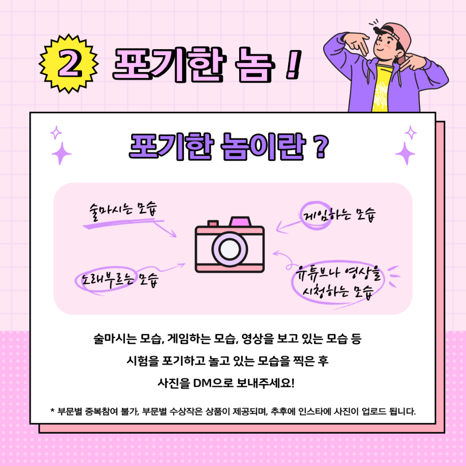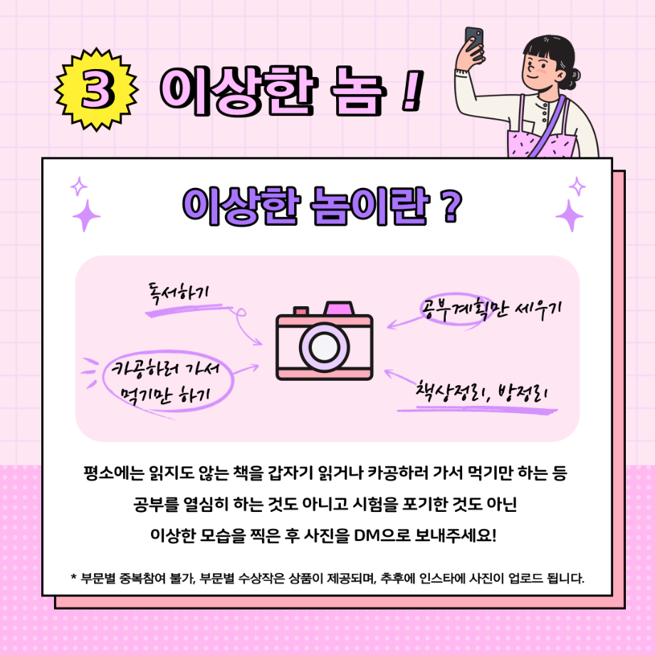 이번 사진공모전 주제는 <놈. 놈. 놈.> - 열공한 놈, 포기한 놈, 이상한 놈으로 3가지 부문에 맞는 사진을 경찰학과 인스타 DM으로 보내주세요!
