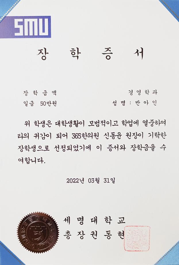 본문 시작 홈으로 커뮤니티 학과소개 학생진로 교과과정 커뮤니티 학과 SNS 홈페이지가이드 학과 갤러리 공지사항 대학원 학과 갤러리 학과 이야기 동아리 학생회 학과 갤러리 페이스북 트위터 프린트 경영학과 20학번 반아인 장학생 경영학과 2600 2022-04-06 03월 31일, 경영학과 20학번 반아인 학생은 학업성적이 우수하고 성실한 학과 생활로 타의 귀감이 되어 365한의원 신동윤 대표원장이 기탁한 장학생으로 선정되었으며 장학금 기탁 및 장학증서 수여식에 참석하였습니다. 목록 이전사회 새내기의 필수 역량 강화 다음 2022 경영학과 체육대회 담당부서 : 경영학과 담당자 : - 연락처 : 043-649-1766 최종수정일 : 2024-10-26 만족도조사 만족도 조사 이 페이지에서 제공하는 정보에 대하여 만족하시나요? 매우만족 만족 보통 불만족 매우불만족