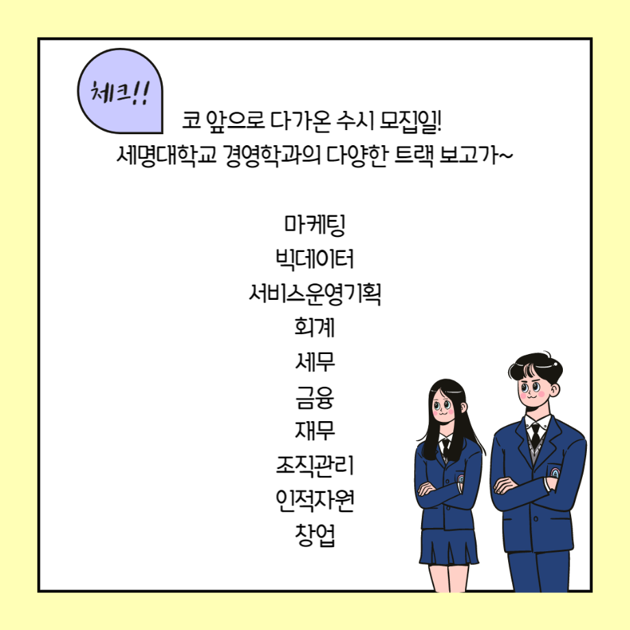 본문 시작 홈으로 커뮤니티 학과소개 학생진로 교과과정 커뮤니티 학과 SNS 홈페이지가이드 학과 갤러리 공지사항 대학원 학과 갤러리 학과 이야기 동아리 학생회 학과 갤러리 페이스북 트위터 프린트 2023학년도 경영학과 수시모집!! 경영학과 3294 2022-09-13 안녕하세요, 세명대학교 경영학과 홍보단 ‘은가비’입니다😎 2023학년도 수시 모집 기간이 하루 앞으로 다가왔습니다!! 다양한 트랙에서 실무형 인재 & 스마트 리더를 양성하는 세명대학교 경영학과!! 많은 관심과 지원 부탁드리며, 여러분을 응원하겠습니다. 우리 내년에 캠퍼스에서 만나요~💙 목록 이전경영학과 장학금 수여식 (feat. 최건동 교수님) 다음 제 6회 사회과학대학 토론대회 개최 담당부서 : 경영학과 담당자 : - 연락처 : 043-649-1766 최종수정일 : 2024-10-26 만족도조사 만족도 조사 이 페이지에서 제공하는 정보에 대하여 만족하시나요? 매우만족 만족 보통 불만족 매우불만족