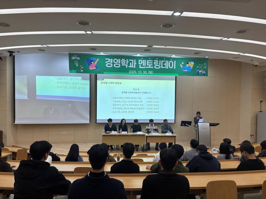본문 시작 홈으로 커뮤니티 학과소개 학생진로 교과과정 커뮤니티 학과 SNS 홈페이지가이드 학과 갤러리 공지사항 대학원 학과 갤러리 학과 이야기 동아리 학생회 학과 갤러리 페이스북 트위터 프린트 [경영학과] 멘토링데이 행사 경영학과 1288 2025-11-03 10월 30일(목) 17시, 학술관 102호에서 경영학과 멘토링데이가 개최되었습니다. 1부에서는 맞춤형 진로/직무 멘토링이, 2부에서는 멘토-멘티 간 자유로운 교류 및 1:1 멘토링, 저녁 식사가 진행되었습니다. 이번 멘토링데이를 통해 학생들이 진로에 대한 이해와 자기주도적 성장 의지를 높일 수 있는 시간이었습니다. 참여해 주신 모든 멘토 멘티 여러분, 수고 많으셨습니다! 목록 이전[일반대학원 경영학과] 논문 발표 및 논문심사 다음 [경영학과] 25년 전기 학위수여식 학과행사 담당부서 : 경영학과 담당자 : - 연락처 : 043-649-1766 최종수정일 : 2024-10-26 만족도조사 만족도 조사 이 페이지에서 제공하는 정보에 대하여 만족하시나요? 매우만족 만족 보통 불만족 매우불만족