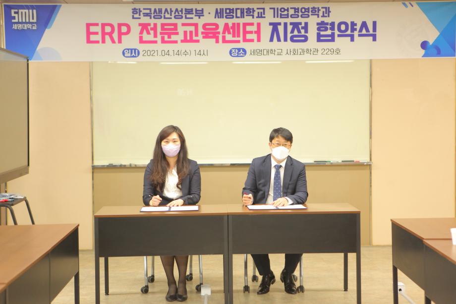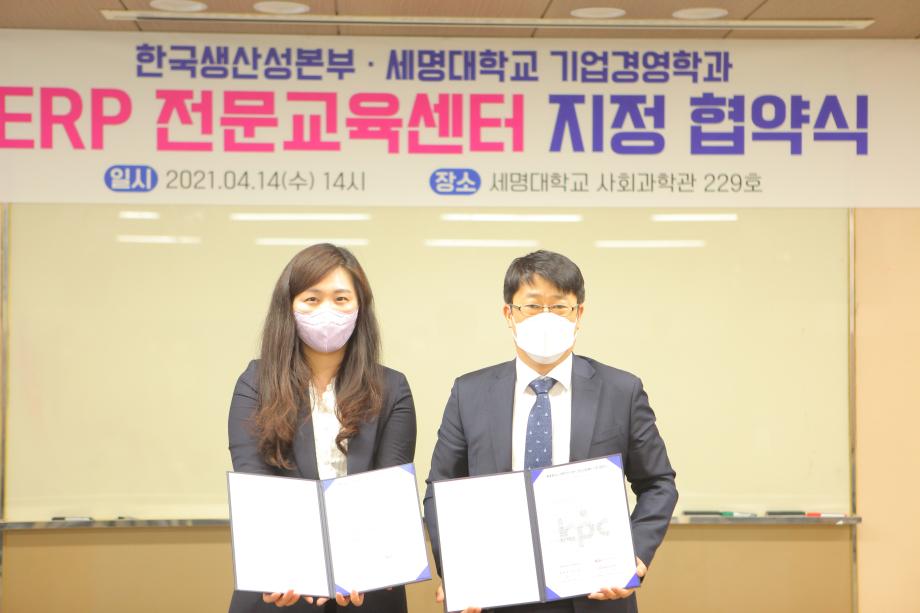 충북 세명대학교 경영학과는 4월 14일(수) 세명대학교 사회과학관에서 한국생산성본부(KPC)와 ERP전문교육센터 지정협약식을 가졌다. 이번 협약식에는 곽지영 경영학과장 외 학과 교수일동, 한국생산성본부 자격검정센터 김준석 센터장, 김현주 충북지역센터장, 오세혁 자격검정센터 연구원이 참석하였다.