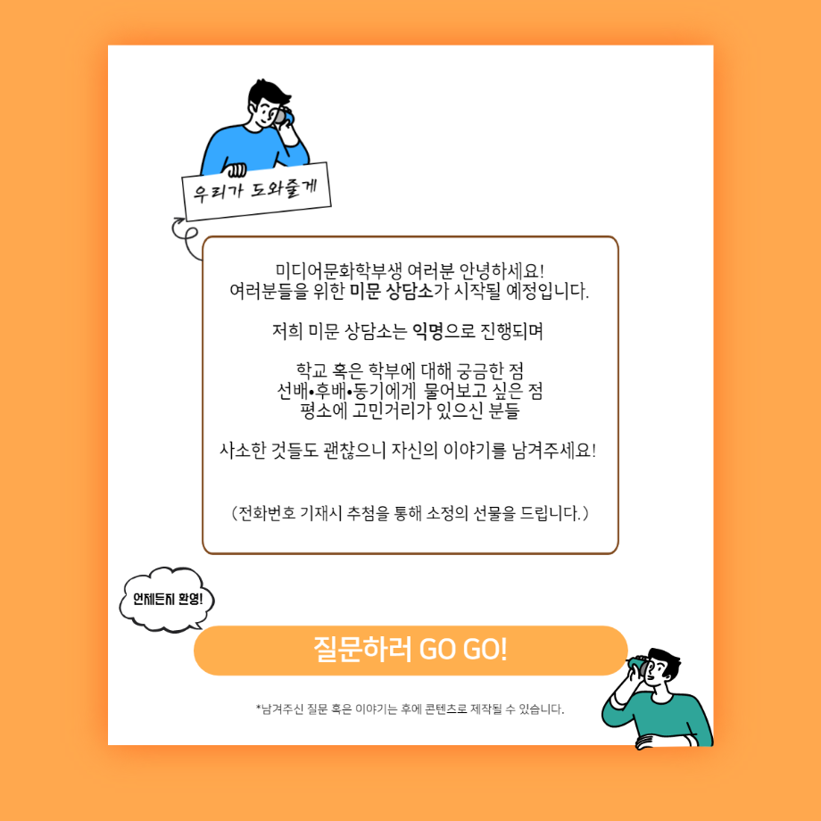 본문 시작 홈으로 커뮤니티 학부소개 교육과정 학부소식 커뮤니티 홈페이지가이드 학생회 학생회 동아리 자료실 장비대여 자유게시판 학생회 페이스북 트위터 프린트 [학생회 활동] 미문상담소 학생회 3258 2022-04-30 미디어문화학부생 여러분 안녕하세요! 미문 상담소에 대해 안내드립니다😊 학부에 대해 궁금한 점, 선배•후배•동기에게 물어보고 싶은 점, 자신의 고민 등 사소한 것들도 괜찮으니 자신의 이야기를 남겨주세요! 익명으로 진행되므로 편하게 작성해주세요 :) *남겨주신 질문 혹은 이야기는 후에 콘텐츠로 제작될 수 있습니다! (전화번호를 남겨주실 경우, 추첨을 통해 소정의 선물을 드릴 예정입니다.) https://naver.me/5okYea3H 목록 이전[학생회 활동] 2021-2 응원 간식 포장 다음 [학생회 활동] 2022년 1학기 선.사.친 활동 중간보고 담당부서 : 미디어문화학부 담당자 : - 연락처 : 043-649-1760 최종수정일 : 2024-10-26 만족도조사 만족도 조사 이 페이지에서 제공하는 정보에 대하여 만족하시나요? 매우만족 만족 보통 불만족 매우불만족