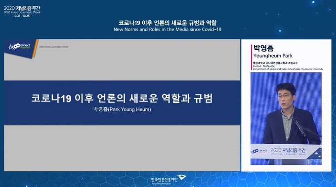최근 언론이 직면한 가장 큰 위기가 신뢰의 추락이라는 데는 이견이 없을 것이다. 비단 한국뿐만 아니라 전 세계가 언론의 신뢰 회복을 위한 규범을 고민하고 있는 가운데, 신종 코로나바이러스 감염증(코로나19) 확산이 언론 신뢰 회복의 기회이면서 오히려 위기일 수 있다는 분석이 제기됐다. 22일 한국언론진흥재단 주최로 열린 ‘2020 저널리즘 주간’의 첫 번째 세션에선 박영흠 협성대 미디엉영상광고학과 초빙교수가 ‘코로나19 이후 언론의 새로운 규범과 역할’을 주제로 강연하며 언론의 신뢰 회복을 위한 고민의 결과를 공유했다.