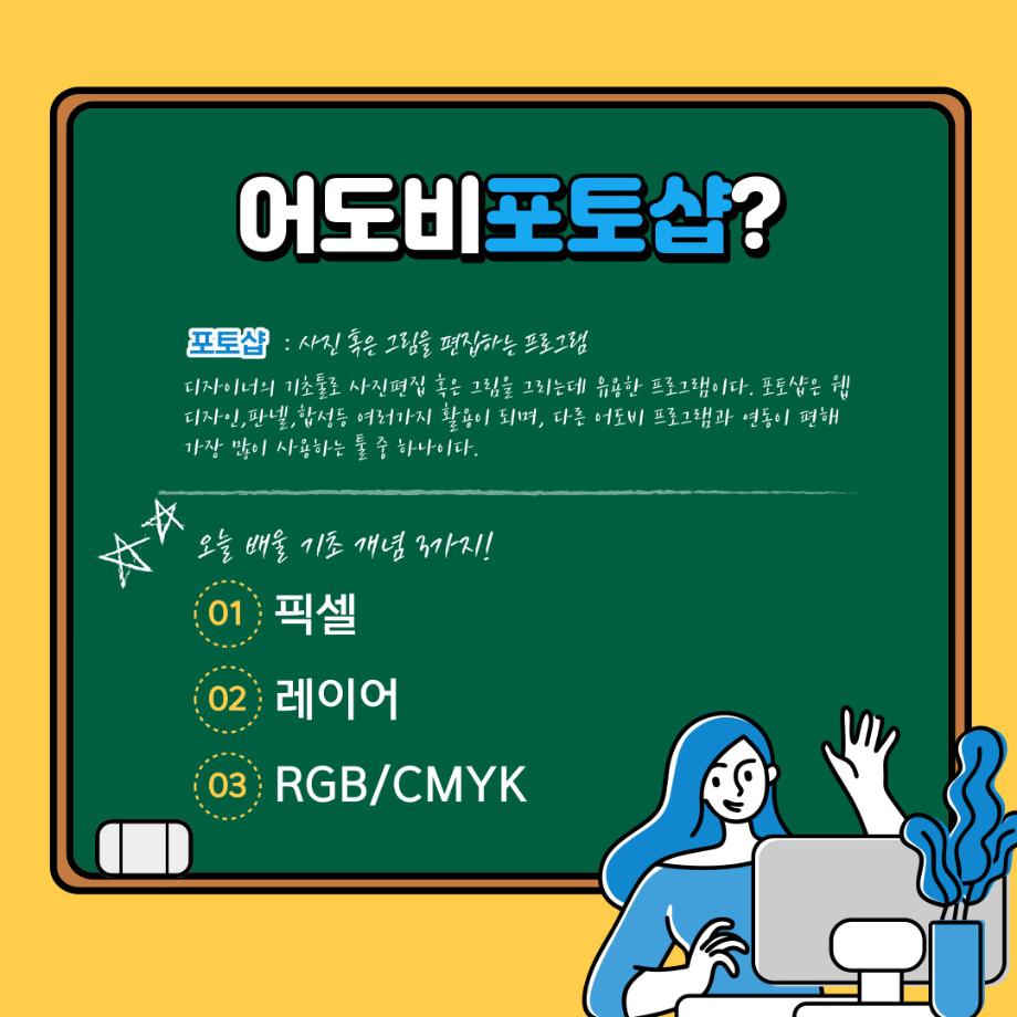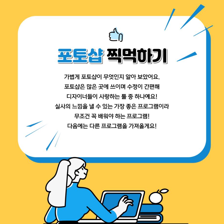 본문 시작 홈으로 학과자랑 학과소개 학과과정 시영소식 입학/취업 AI 학과자랑 SNS소통 홈페이지가이드 갤러리 학과자랑 갤러리 공모전 동아리 졸업전시회 갤러리 페이스북 트위터 프린트 예비 대학생을 위한 디자인 프로그램 설명 2탄 (포토샵) 시각영상디자인학과 2338 2022-02-07 1학년때 배우는 디자인 툴 포토샵입니다. 목록 이전예비 대학생을 위한 디자인 프로그램 설명 1탄 (일러스트레이터) 다음 예비 대학생을 위한 디자인 프로그램 설명 3탄 (애프터이펙트) 담당부서 : 시각영상디자인학과 담당자 : - 연락처 : 043-649-1726 최종수정일 : 2024-10-26 만족도조사 만족도 조사 이 페이지에서 제공하는 정보에 대하여 만족하시나요? 매우만족 만족 보통 불만족 매우불만족