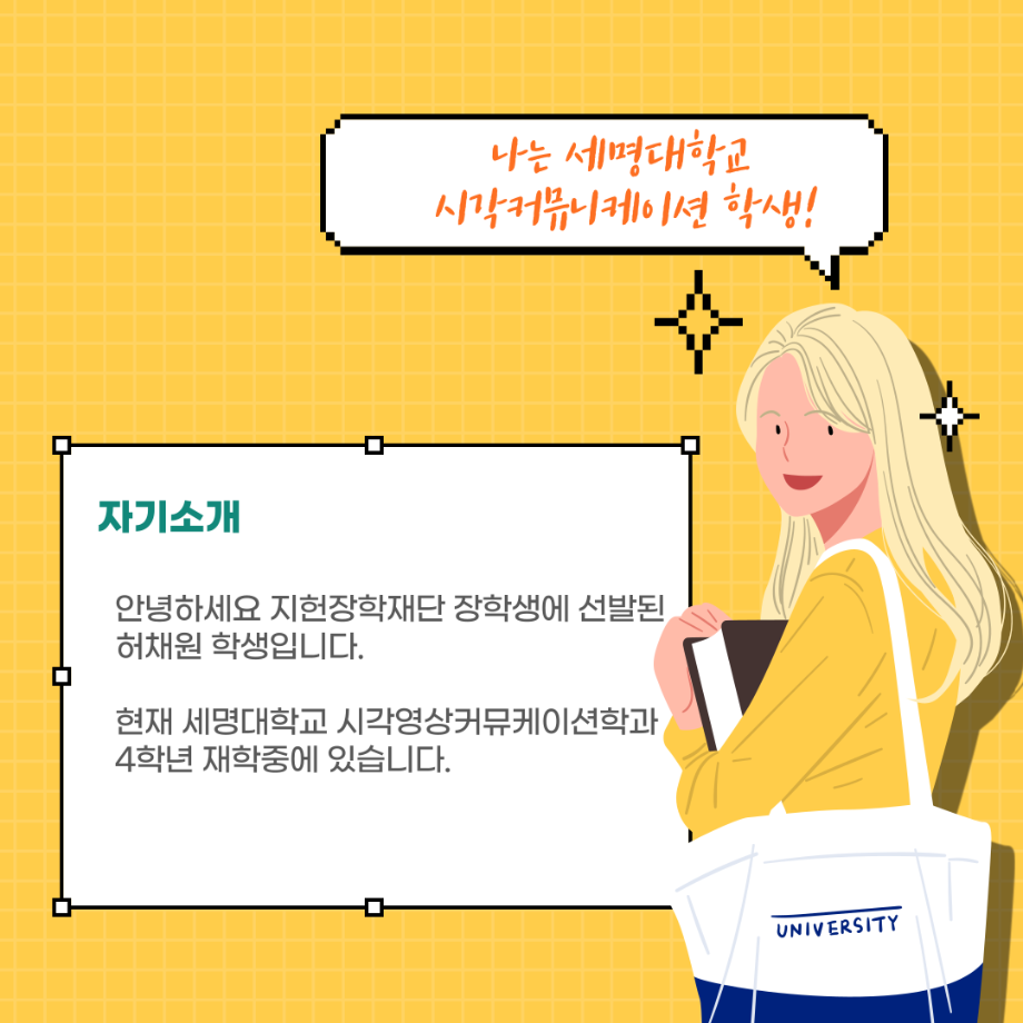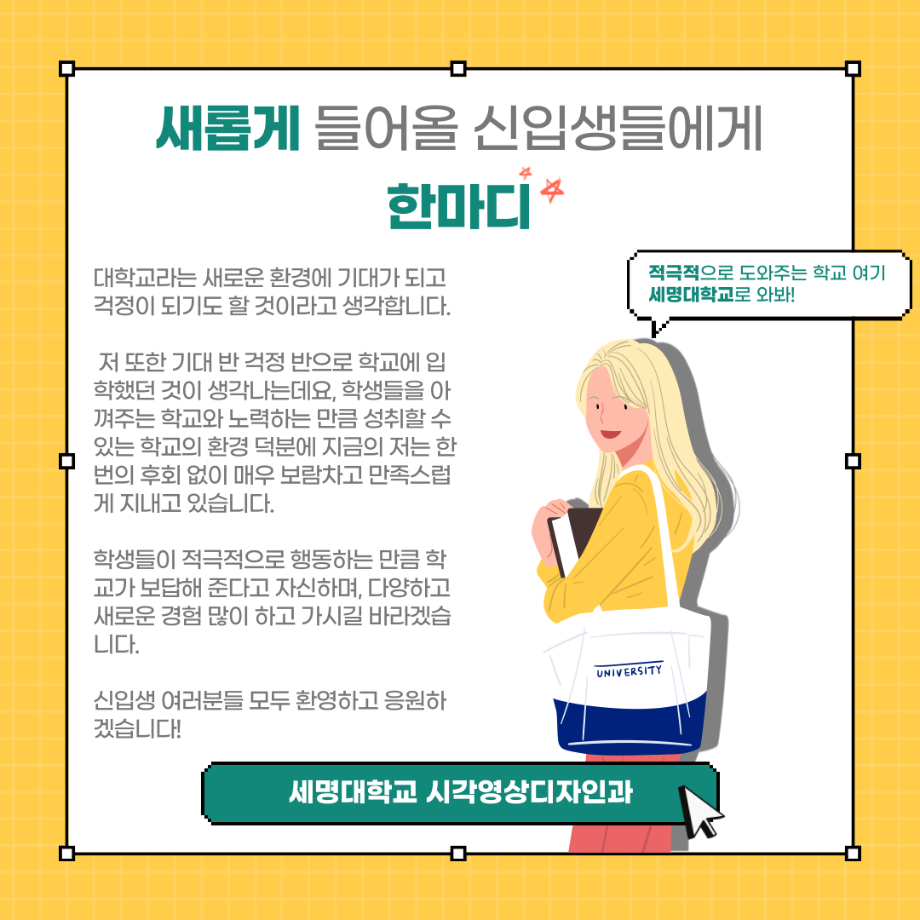 본문 시작 홈으로 학과자랑 학과소개 학과과정 시영소식 입학/취업 AI 학과자랑 SNS소통 홈페이지가이드 갤러리 학과자랑 갤러리 공모전 동아리 졸업전시회 갤러리 페이스북 트위터 프린트 지헌장학재단 장학생 소개 (1) 시각영상디자인학과 4348 2022-04-28 목록 이전귀여운 세명대 마스코트 이모티콘! 다음 지헌장학재단 장학생 소개(2) 담당부서 : 시각영상디자인학과 담당자 : - 연락처 : 043-649-1726 최종수정일 : 2024-10-26 만족도조사 만족도 조사 이 페이지에서 제공하는 정보에 대하여 만족하시나요? 매우만족 만족 보통 불만족 매우불만족