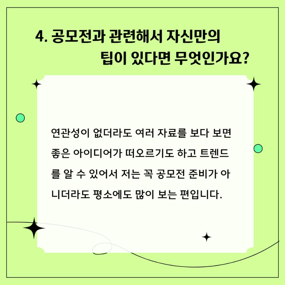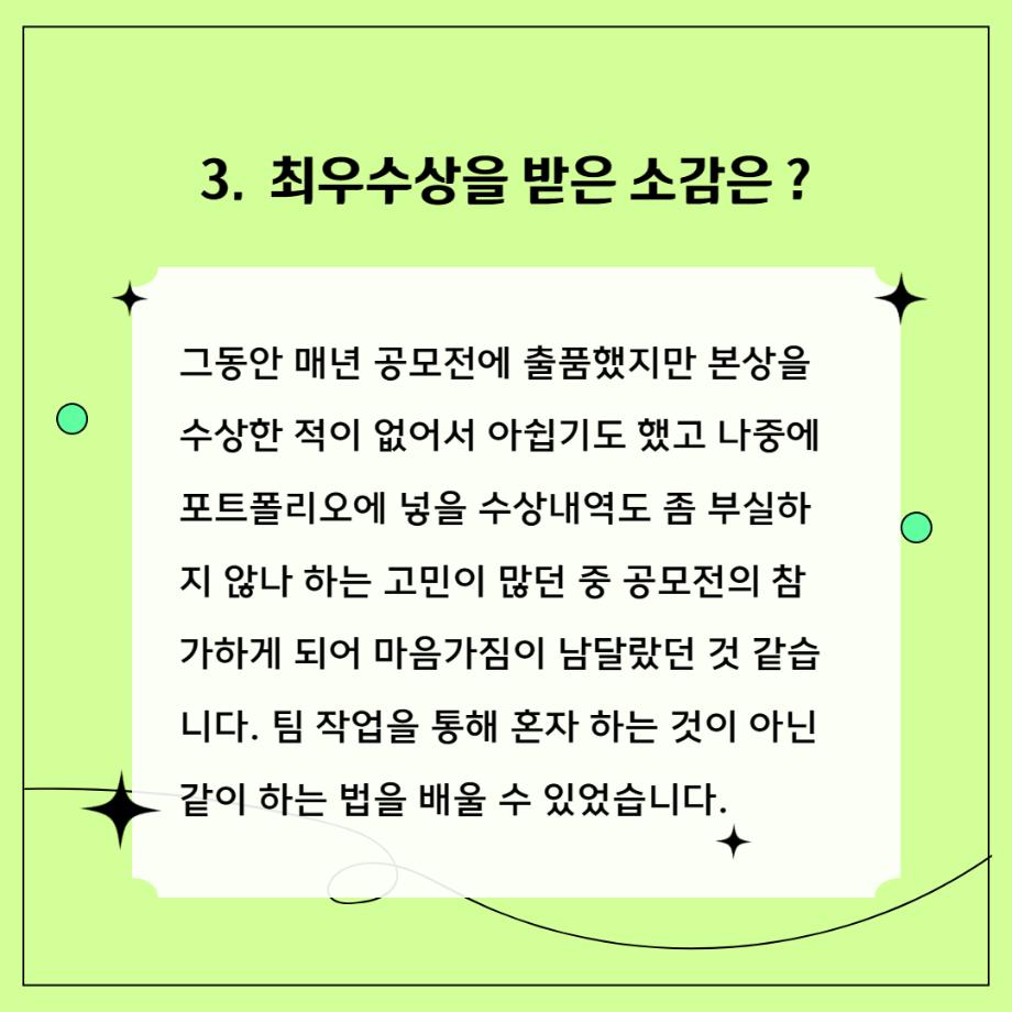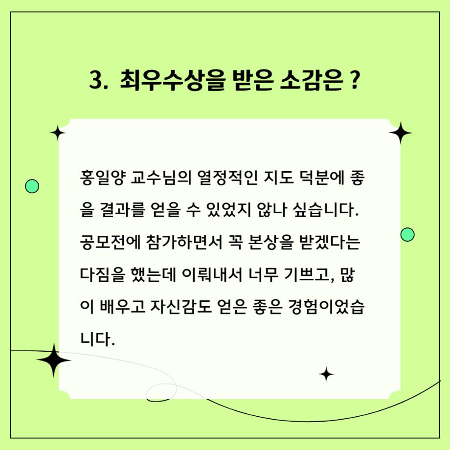 본문 시작 홈으로 학과자랑 학과소개 학과과정 시영소식 입학/취업 AI 학과자랑 SNS소통 홈페이지가이드 갤러리 학과자랑 갤러리 공모전 동아리 졸업전시회 갤러리 페이스북 트위터 프린트 공모전 최우수상 입상자 인터뷰 - 김한별 학생 시각영상디자인학과 3202 2023-06-12 목록 이전공모전 대상 입상자 인터뷰! - 이성복 학생 다음 벽화활동 인터뷰 - 박범준 학생 담당부서 : 시각영상디자인학과 담당자 : - 연락처 : 043-649-1726 최종수정일 : 2024-10-26 만족도조사 만족도 조사 이 페이지에서 제공하는 정보에 대하여 만족하시나요? 매우만족 만족 보통 불만족 매우불만족