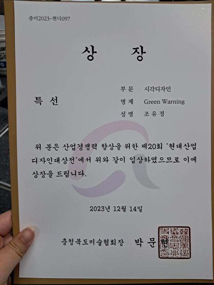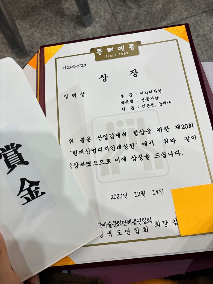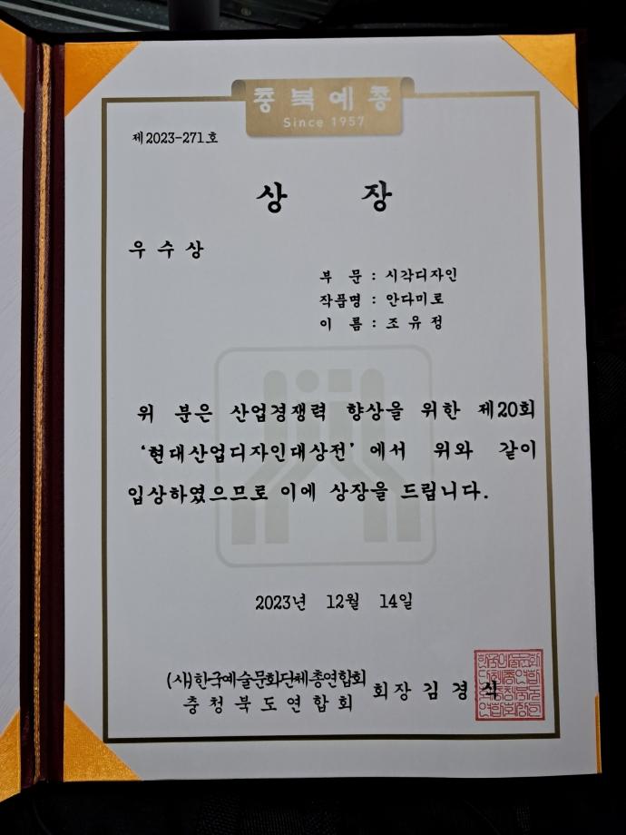 본문 시작 홈으로 학과자랑 학과소개 학과과정 시영소식 입학/취업 AI 학과자랑 SNS소통 홈페이지가이드 갤러리 학과자랑 갤러리 공모전 동아리 졸업전시회 갤러리 페이스북 트위터 프린트 제 20회 현대산업디자인대상전 시상식 시각영상디자인학과 2399 2023-12-15 12월 15일, 제 20회 현대산업디자인대상전에서 세명대학교 시각영상디자인과 학생들이 입상을 하여 시상식에 초대되었습니다. 수상자는 [ 우수상 (조유정 )] [ 장려상 (박범준,김윤정,윤세나) ] [ 특선 (김예원, 박서정, 박수빈, 송윤진, 윤세나, 김윤정, 허유빈, 조유정, 황정윤) ] [ 입선 (김건우, 김윤정, 신유빈) ]입니다. 수상하신 분들, 그리고 아쉽게도 수상하지 못한 학생분들도 모두 수고하셨습니다. 목록 이전2023학년도 캡스톤디자인 경진대회 - 최우수상 2작품 다음 행복한 성탄과 연휴되세요. 담당부서 : 시각영상디자인학과 담당자 : - 연락처 : 043-649-1726 최종수정일 : 2024-10-26 만족도조사 만족도 조사 이 페이지에서 제공하는 정보에 대하여 만족하시나요? 매우만족 만족 보통 불만족 매우불만족